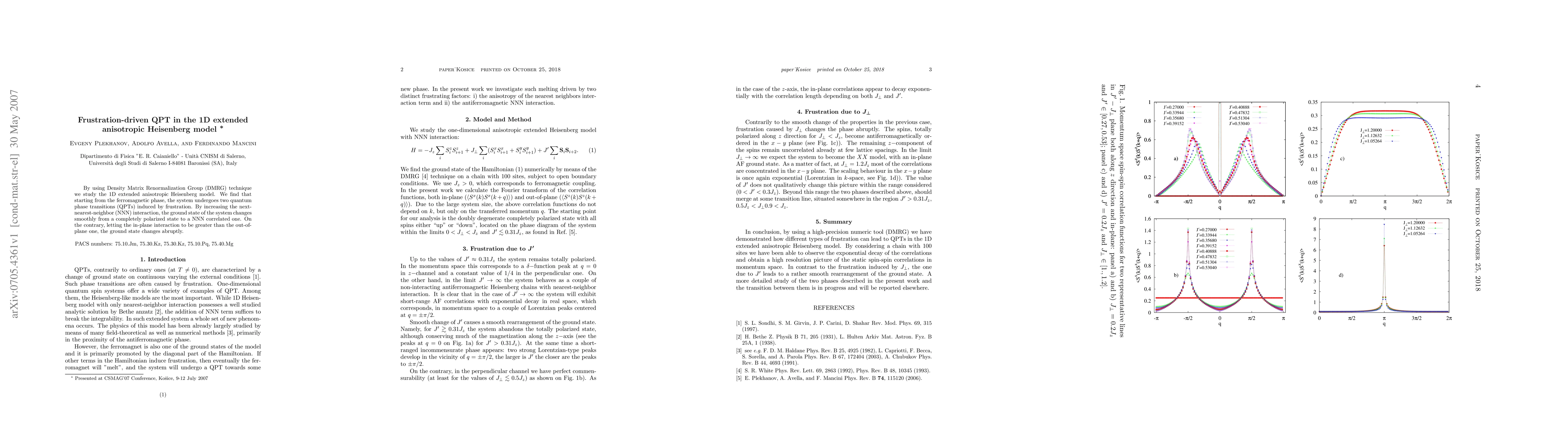 By using Density Matrix Renormalization Group (DMRG) technique we study the 1D extended anisotropic Heisenberg model. We find that starting from the ferromagnetic phase, the system undergoes two quantum phase transitions (QPTs) induced by frustration. By increasing the next-nearest-neighbor (NNN) interaction, the ground state of the system changes smoothly from a completely polarized state to a NNN correlated one. On the contrary, letting the in-plane interaction to be greater than the out-of-plane one, the ground state changes abruptly.