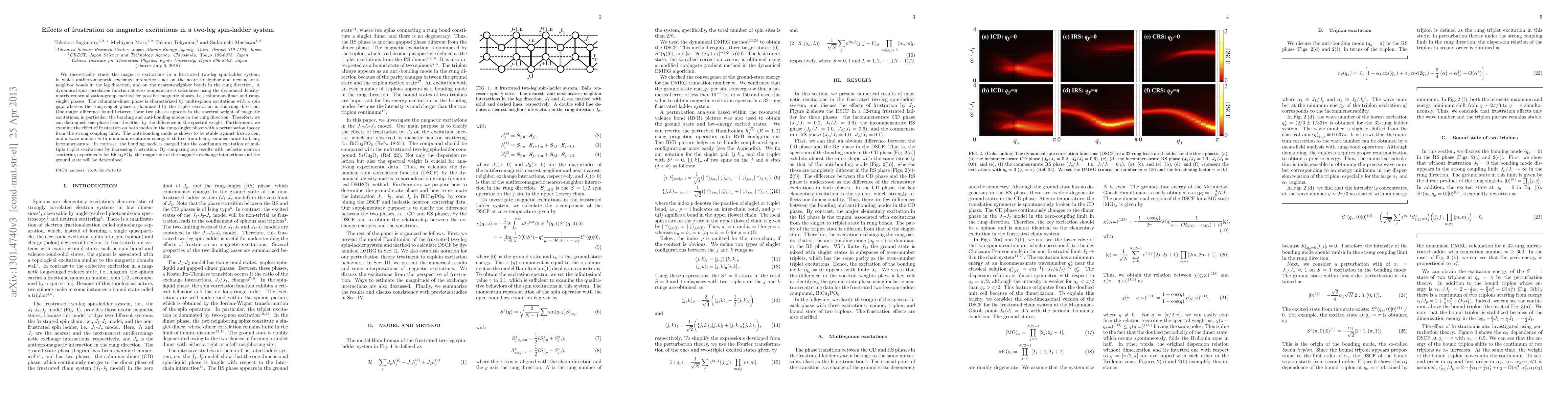 This paper investigates magnetic excitations in a frustrated two-leg spin-ladder system using the dynamical density-matrix renormalization-group method. It distinguishes between columnar-dimer and rung-singlet phases based on spectral weight differences, particularly in bonding and anti-bonding modes, and examines the frustration effect on these modes, showing stability in the anti-bonding mode and continuum merging in the bonding mode.