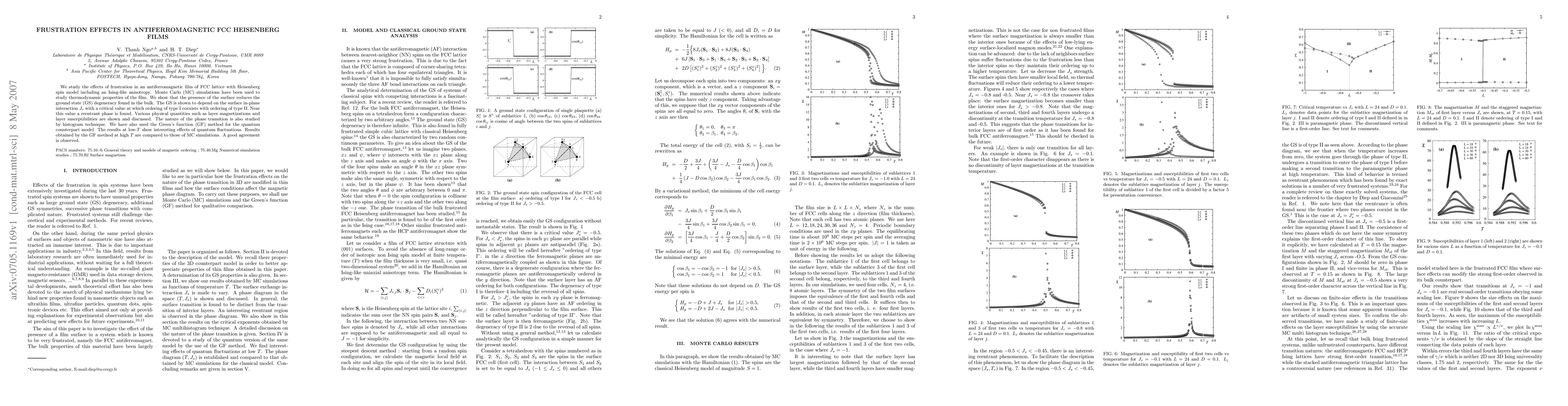 This paper investigates frustration effects in antiferromagnetic FCC Heisenberg films using Monte Carlo simulations and the Green's function method. It finds that surface interactions reduce ground state degeneracy, leading to a critical value where two ordering types coexist, and a reentrant phase near this value. Quantum fluctuations significantly impact low-temperature results.