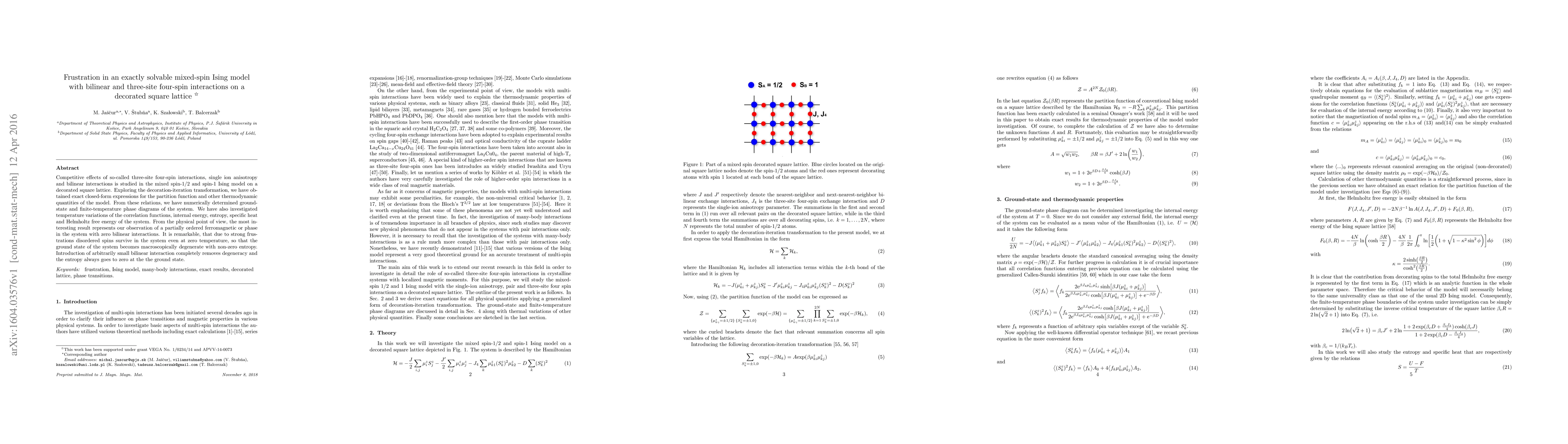 This paper studies a mixed-spin Ising model on a decorated square lattice with bilinear and three-site four-spin interactions, deriving exact expressions for the partition function and thermodynamic quantities. It reveals a partially ordered ferromagnetic phase with macroscopic degeneracy and non-zero entropy at zero temperature due to frustration, which is resolved by introducing even small bilinear interactions.