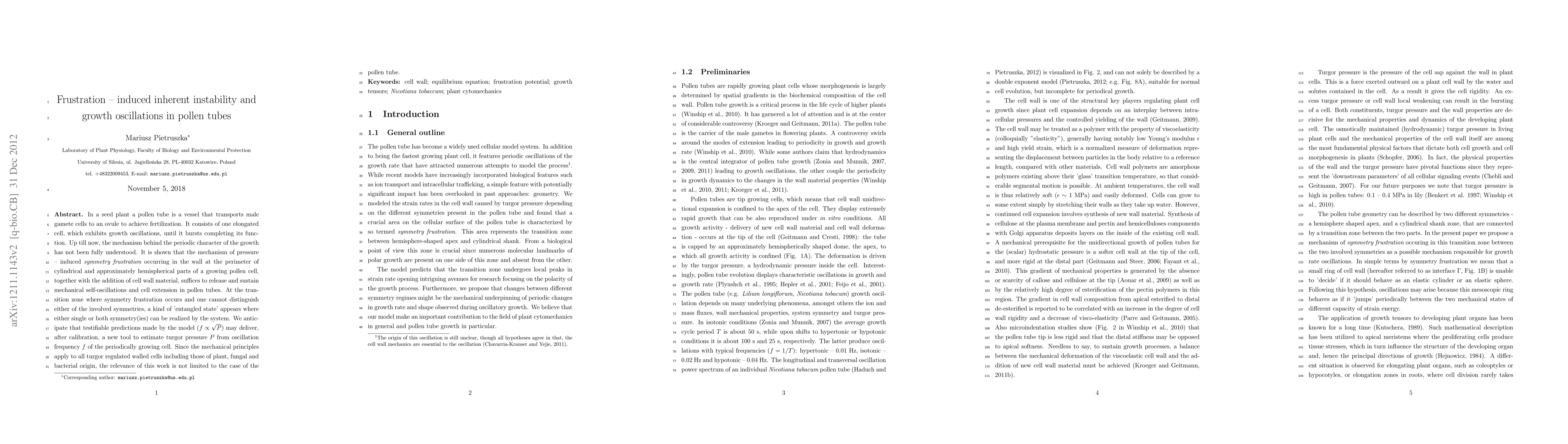 In a seed plant a pollen tube is a vessel that transports male gamete cells to an ovule to achieve fertilization. It consists of one elongated cell, which exhibits growth oscillations, until it bursts completing its function. Up till now, the mechanism behind the periodic character of the growth has not been fully understood. An attempt to understand these oscillations lead us to an attractive scenario: We show that the mechanism of pressure-induced symmetry frustration occuring in the wall at the perimeter of cylindrical and approximately hemispherical parts of a growing pollen cell, together with the addition of cell wall material, suffices to release and sustain mechanical self-oscillations and cell extension in pollen tubes. At the transition zone where symmetry frustration occurs and one cannot distinguish either of the involved symmetries, a kind of 'entangled state' appears where either single or both symmetry(ies) can be realized by the system. We anticipate that testifiable predictions made by the model may deliver, after calibration, a new tool to estimate turgor pressure from oscillation period of the growing cell. Since the mechanical principles apply to all turgor regulated walled cells including those of plant, fungal and bacterial origin, the relevance of this work is not limited to the case of the pollen tube.