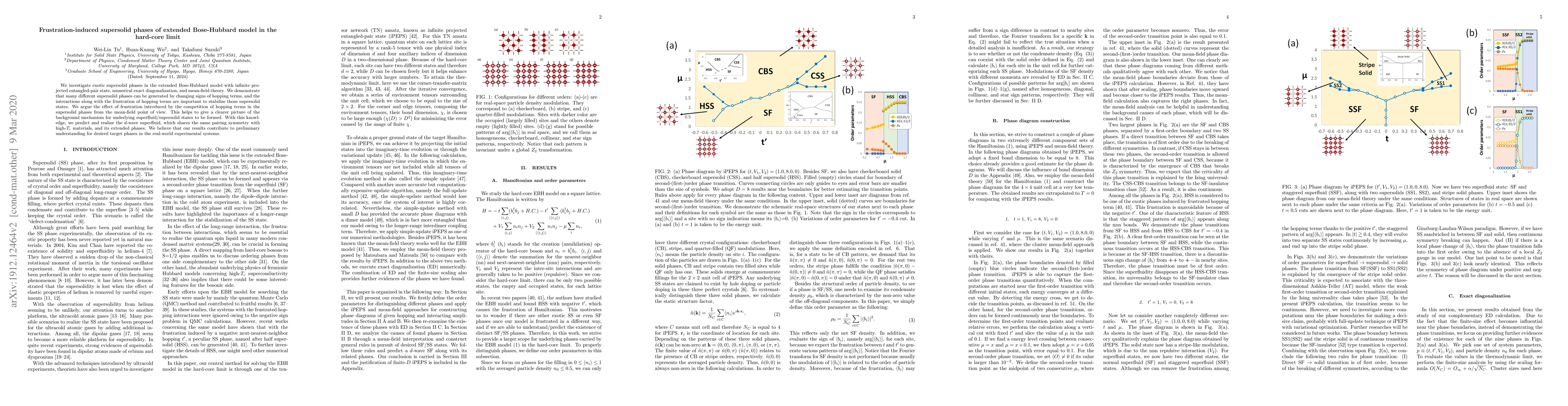 This paper explores the emergence of various supersolid phases in the extended Bose-Hubbard model through frustration induced by competing hopping terms, using numerical exact diagonalization and mean-field theory. The study reveals the importance of frustration and interactions in stabilizing these phases, leading to the prediction of $d$-wave superfluid states akin to high-$T_c$ materials.