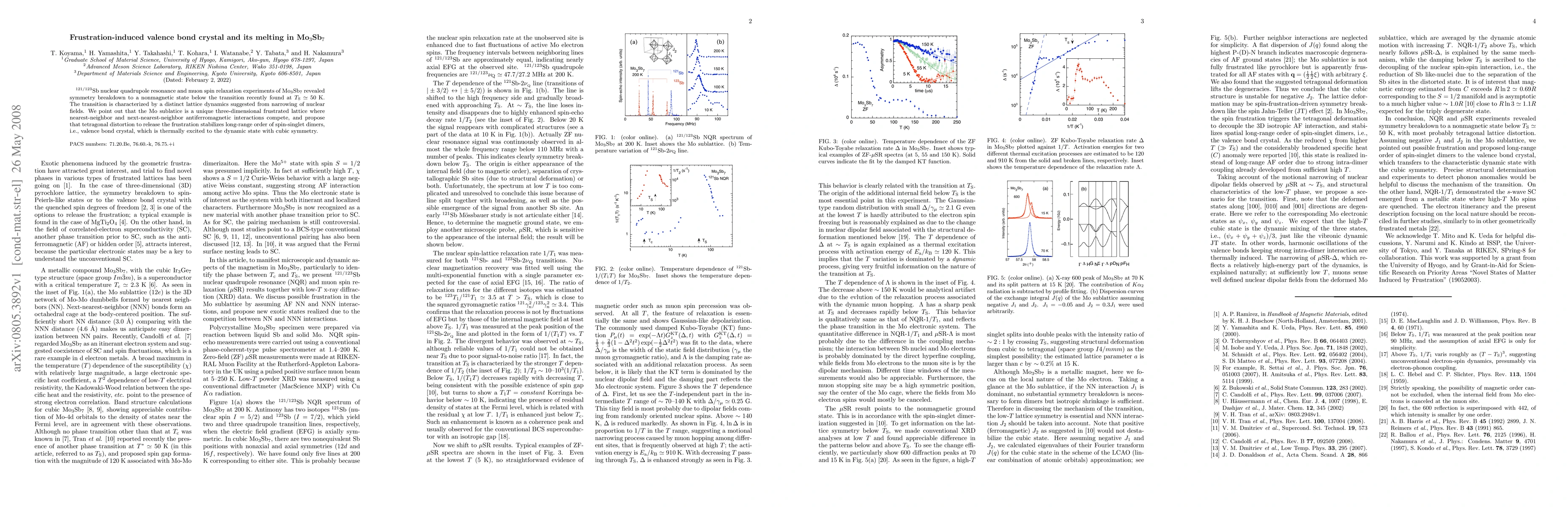 121/123Sb nuclear quadrupole resonance and muon spin relaxation experiments of Mo3Sb7 revealed symmetry breakdown to a nonmagnetic state below the transition recently found at TS=50 K. The transition is characterized by a distinct lattice dynamics suggested from narrowing of nuclear fields. We point out that the Mo sublatice is a unique three-dimensional frustrated lattice where nearest-neighbor and next-nearest-neighbor antiferromagnetic interactions compete, and propose that tetragonal distortion to release the frustration stabilizes long-range order of spin-singlet dimers, i.e., valence bond crystal, which is thermally excited to the dynamic state with cubic symmetry.