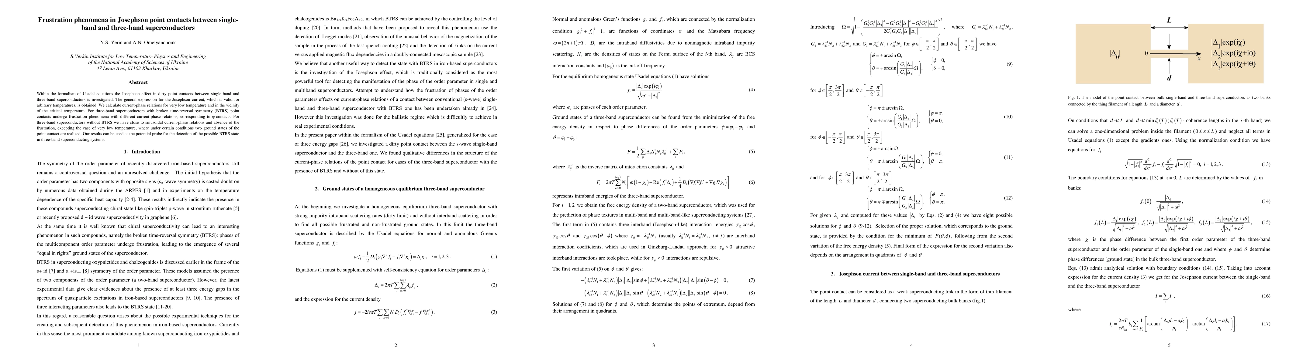 This paper explores the Josephson effect in dirty point contacts between single-band and three-band superconductors using Usadel equations, revealing distinct current-phase relations. It finds that three-band superconductors with broken time-reversal symmetry exhibit frustration phenomena, while those without show near sinusoidal relations, except for rare low-temperature dual ground states.