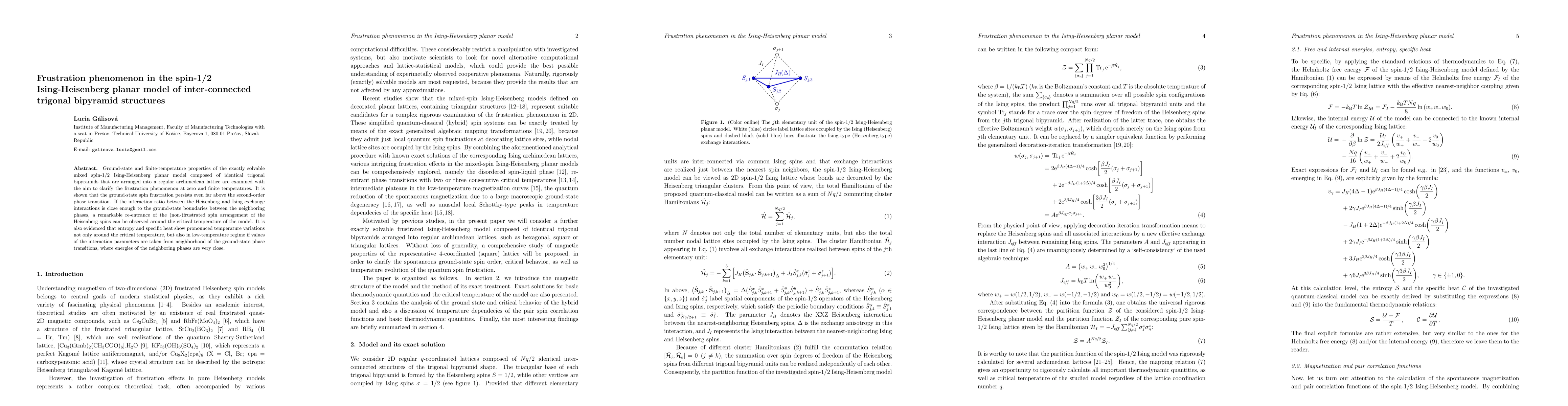 Ground-state and finite-temperature properties of the exactly solvable mixed spin-1/2 Ising-Heisenberg planar model composed of identical trigonal bipyramids that are arranged into a regular archimedean lattice are examined with the aim to clarify the frustration phenomenon at zero and finite temperatures. It is shown that the ground-state spin frustration persists even far above the second-order phase transition. If the interaction ratio between the Heisenberg and Ising exchange interactions is close enough to the ground-state boundaries between the neighboring phases, a remarkable re-entrance of the (non-)frustrated spin arrangement of the Heisenberg spins can be observed around the critical temperature of the model. It is also evidenced that entropy and specific heat show pronounced temperature variations not only around the critical temperature, but also in low-temperature regime if values of the interaction parameters are taken from neighborhood of the ground-state phase transitions, where energies of the neighboring phases are very close.