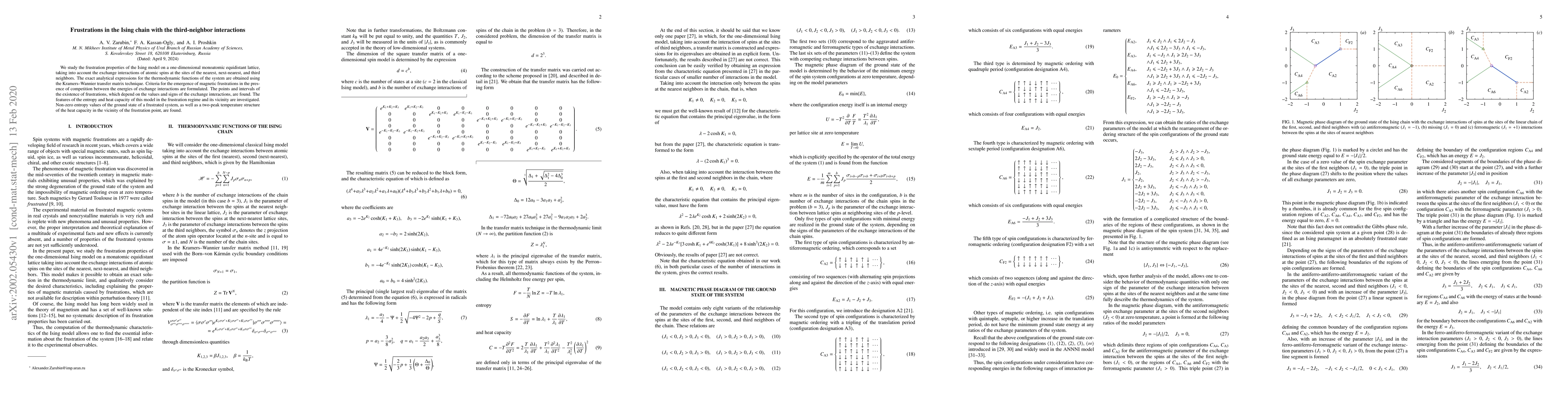 This paper investigates the frustration properties of the Ising model on a one-dimensional lattice with interactions between nearest, next-nearest, and third-neighbor spins. Using the Kramers-Wannier transfer matrix technique, it identifies conditions for magnetic frustration and analyzes the entropy and heat capacity, revealing non-zero ground state entropy and a two-peak heat capacity structure near the frustration point.