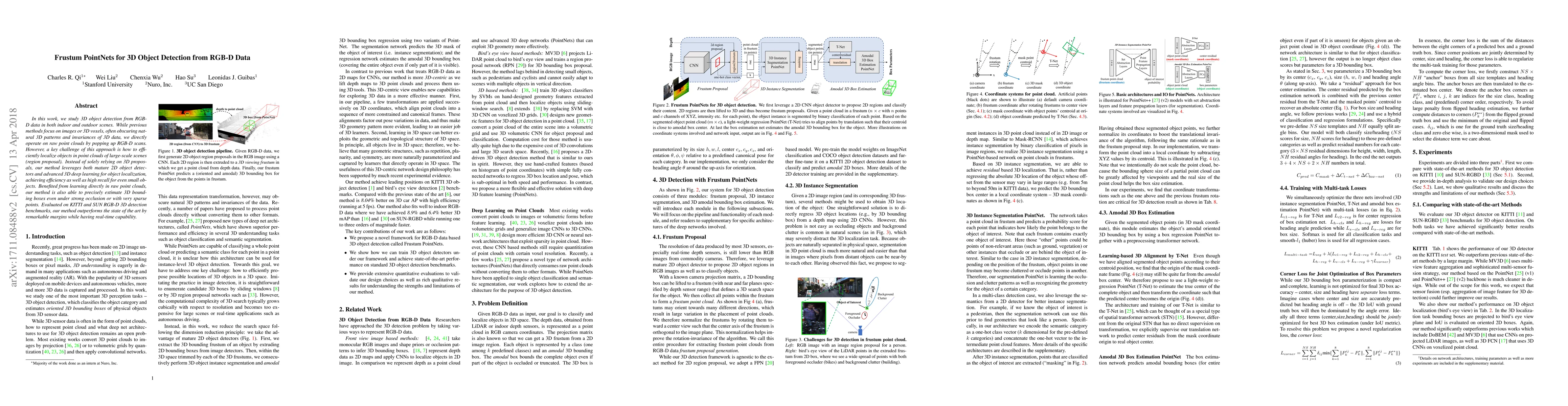This paper proposes Frustum PointNets for 3D object detection from RGB-D data, combining 2D object detectors and 3D deep learning to efficiently localize objects in large-scale scenes. The method outperforms state-of-the-art benchmarks on KITTI and SUN RGB-D datasets while achieving real-time performance.