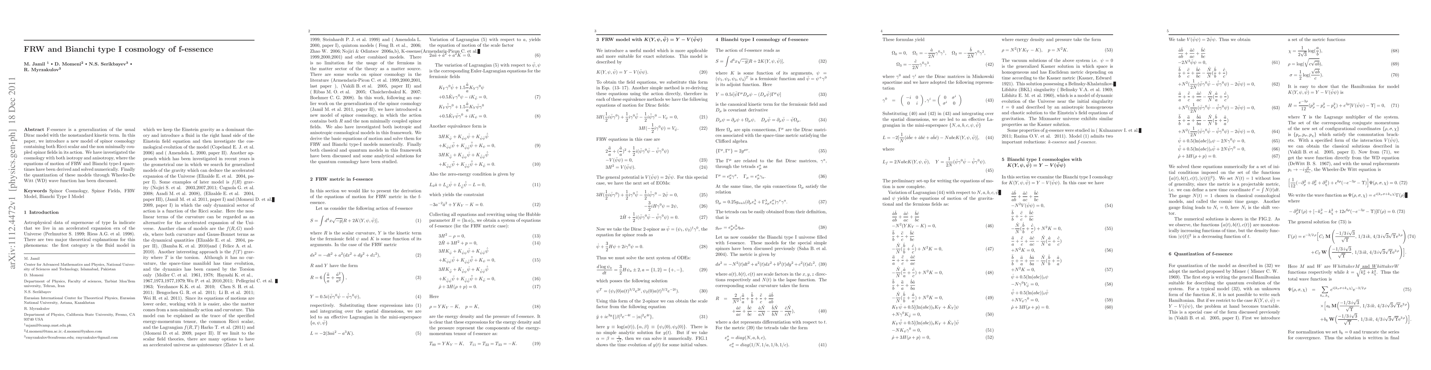 This paper introduces a new spinor cosmology model called f-essence with a nonstandard kinetic term and explores its implications for both isotropic and anisotropic FRW and Bianchi type I cosmologies, deriving and solving their equations of motion numerically, and discussing the quantization via the Wheeler-De Witt wave function.