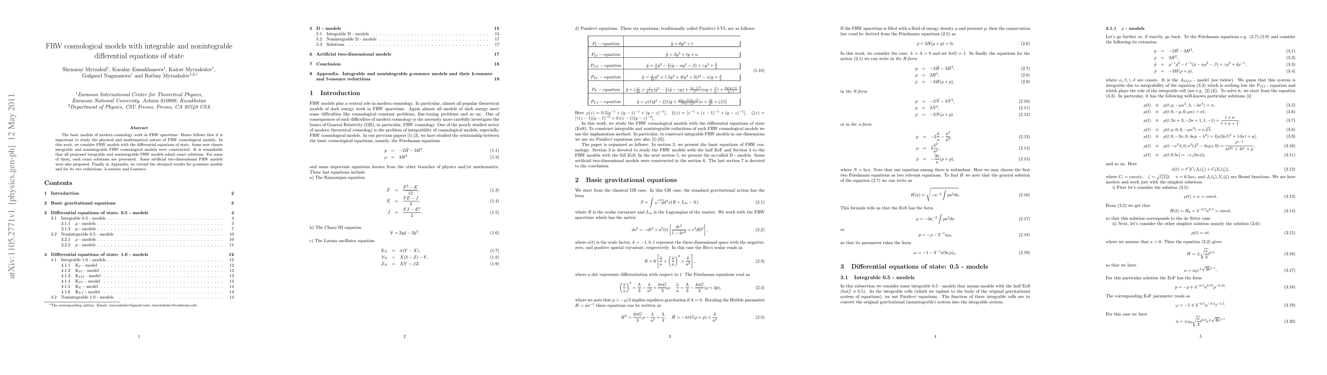 This paper explores FRW cosmological models with integrable and nonintegrable differential equations of state, constructing new classes of models that admit exact solutions. It also proposes artificial two-dimensional FRW models and extends the findings to g-essence, k-essence, and f-essence models.