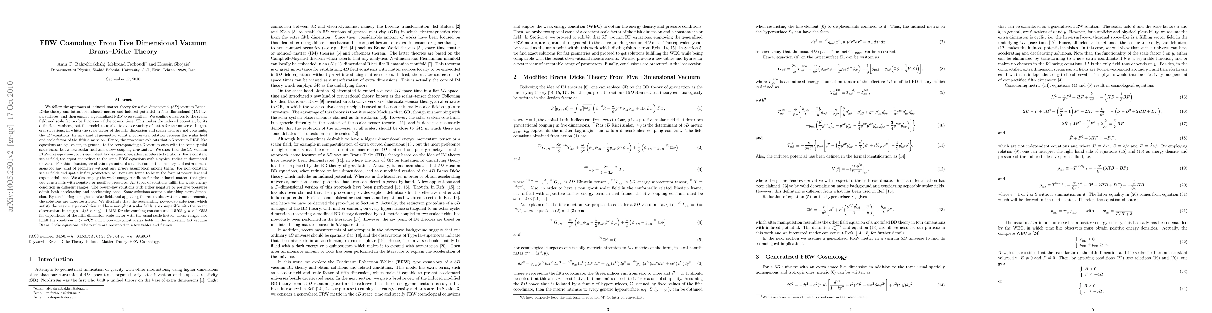 We follow approach of induced matter theory for 5D vacuum BD, introduce induced matter and potential in 4D hypersurfaces, and employ generalized FRW type solution. We confine ourselves to scalar field and scale factors be functions of the time. This makes the induced potential, by its definition, vanishes. When the scale factor of fifth dimension and scalar field are not constants, 5D eqs for any geometry admit a power law relation between scalar field and scale factor of fifth dimension. Hence the procedure exhibits that 5D vacuum FRW like eqs are equivalent, in general, to corresponding 4D vacuum ones with the same spatial scale factor but new scalar field and coupling constant. We show that 5D vacuum FRW like eqs or its equivalent 4D vacuum ones admit accelerated solutions. For constant scalar field, eqs reduce to usual FRW eqs with typical radiation dominated universe. For this situation we obtain dynamics of scale factors for any geometry without any priori assumption. For nonconstant scalar fields and spatially flat geometries, solutions are found to be power law and exponential ones. We also employ weak energy condition for induced matter, that allows negative/positive pressures. All types of solutions fulfill WEC in different ranges. The power law solutions with negative/positive pressures admit both decelerating and accelerating ones. Some solutions accept shrinking extra dimension. By considering nonghost scalar fields and recent observational measurements, solutions are more restricted. We illustrate that accelerating power law solutions, which satisfy WEC and have nonghost fields, are compatible with recent observations in ranges -4/3 < \omega - -1.3151 and 1.5208 - n < 1.9583 for dependence of fifth dimension scale factor with usual scale factor. These ranges also fulfill condition nonghost fields in the equivalent 4D vacuum BD eqs.