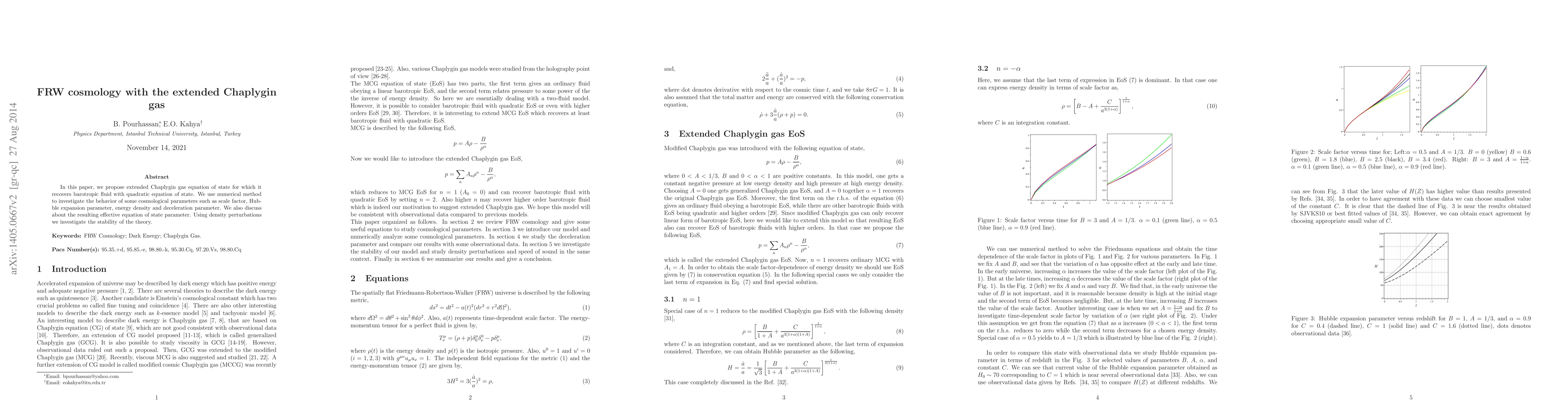 This paper proposes an extended Chaplygin gas equation of state that recovers a barotropic fluid with a quadratic equation of state, investigating its cosmological implications through numerical simulations and density perturbations.