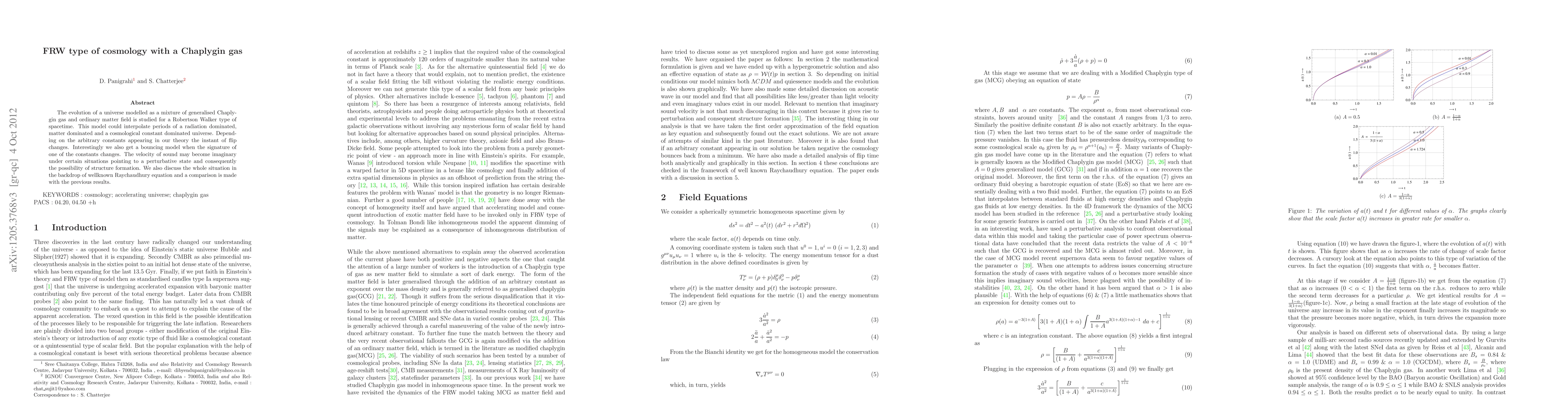Researchers explored a cosmology model that combines Chaplygin gas and ordinary matter, finding it can produce bouncing universes and imaginary sound velocities under certain conditions.