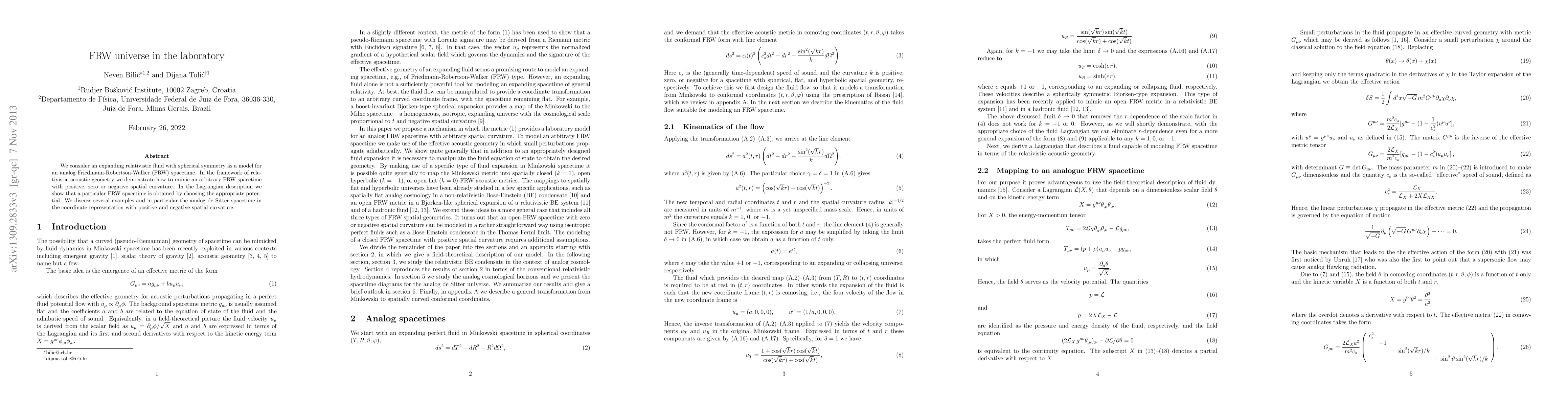 Researchers created a laboratory model of an expanding universe with positive, zero, or negative spatial curvature using relativistic acoustic geometry and specific potential functions.