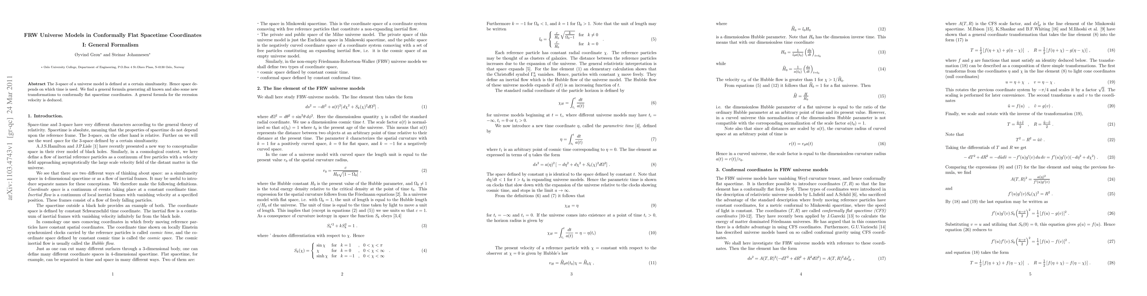 This paper develops a general formalism for transforming Friedmann-Robertson-Walker (FRW) universe models into conformally flat spacetime coordinates, providing a formula for generating known and new transformations and deriving a general expression for recession velocity.
