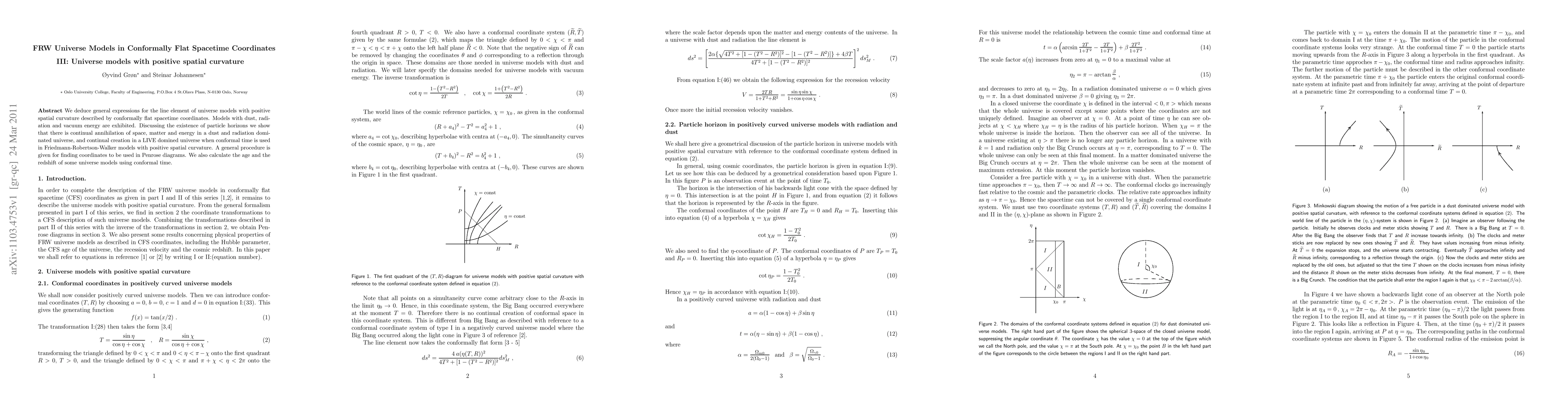 This paper derives expressions for the line element of universe models with positive spatial curvature in conformally flat coordinates, examining models with dust, radiation, and vacuum energy. It discusses particle horizons and the continual annihilation and creation processes in different universe models, providing a method for finding coordinates for Penrose diagrams and calculating age and redshift using conformal time.