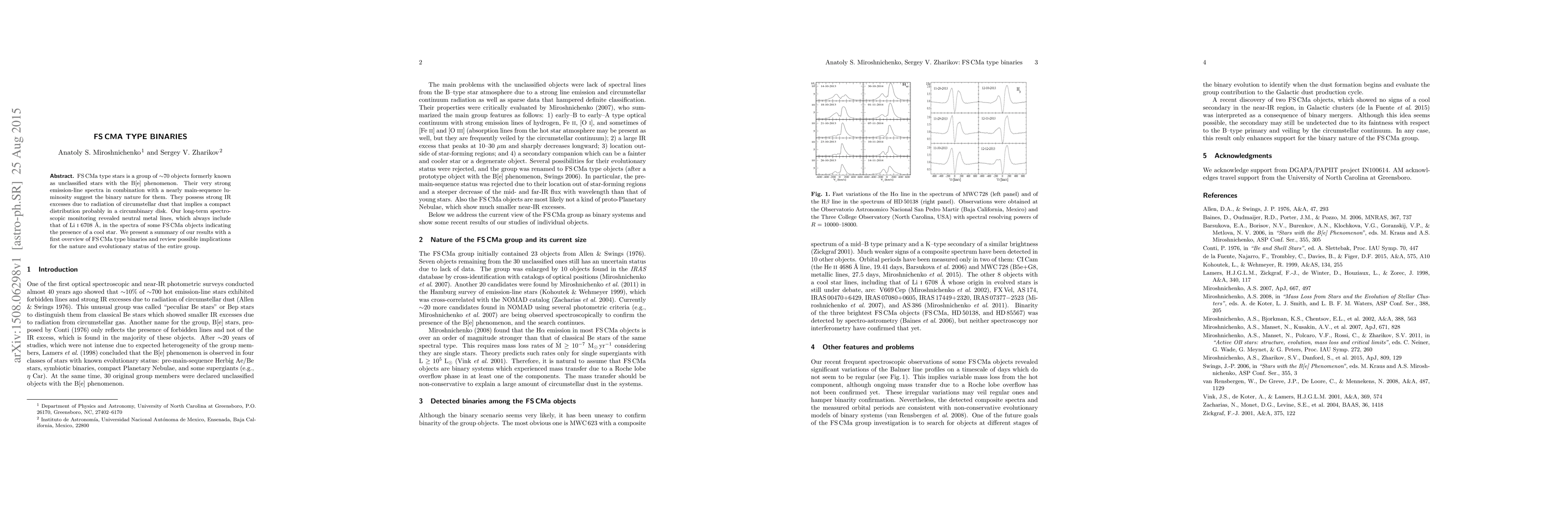FS CMa type stars is a group of ~70 objects formerly known as unclassified stars with the B[e] phenomenon. Their very strong emission-line spectra in combination with a nearly main-sequence luminosity suggest the binary nature for them. They possess strong IR excesses due to radiation of circumstellar dust that implies a compact distribution probably in a circumbinary disk. Our long-term spectroscopic monitoring revealed neutral metal lines, which always include that of Li I 6708 \AA, in the spectra of some FS CMa objects indicating the presence of a cool star. We present a summary of our results with a first overview of FS CMa type binaries and review possible implications for the nature and evolutionary status of the entire group.