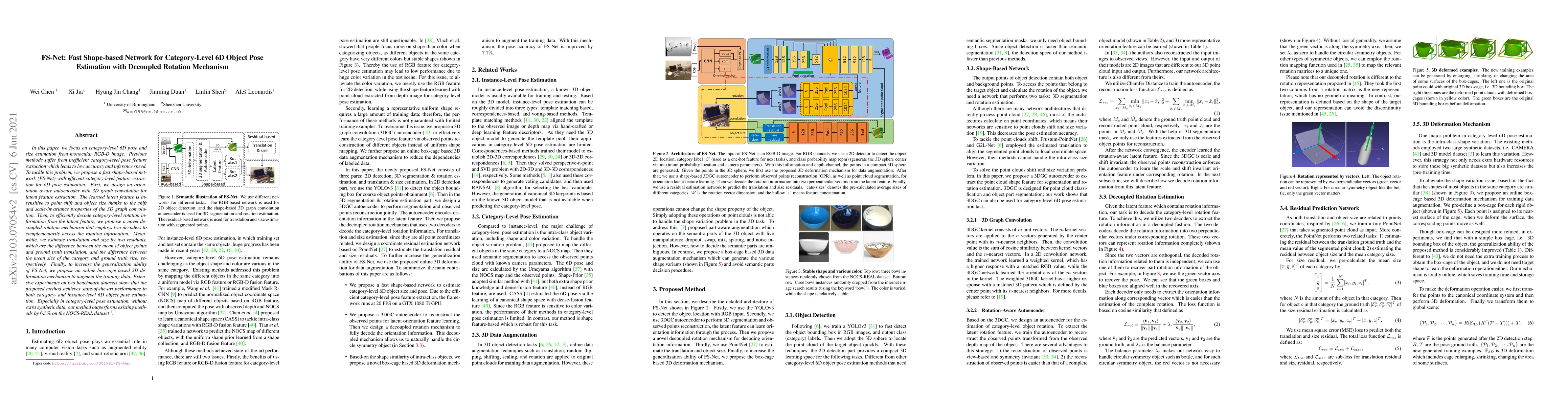 FS-Net proposes a fast shape-based network for category-level 6D object pose estimation using a decoupled rotation mechanism and 3D graph convolution for efficient feature extraction, achieving state-of-the-art performance without requiring extra synthetic data.