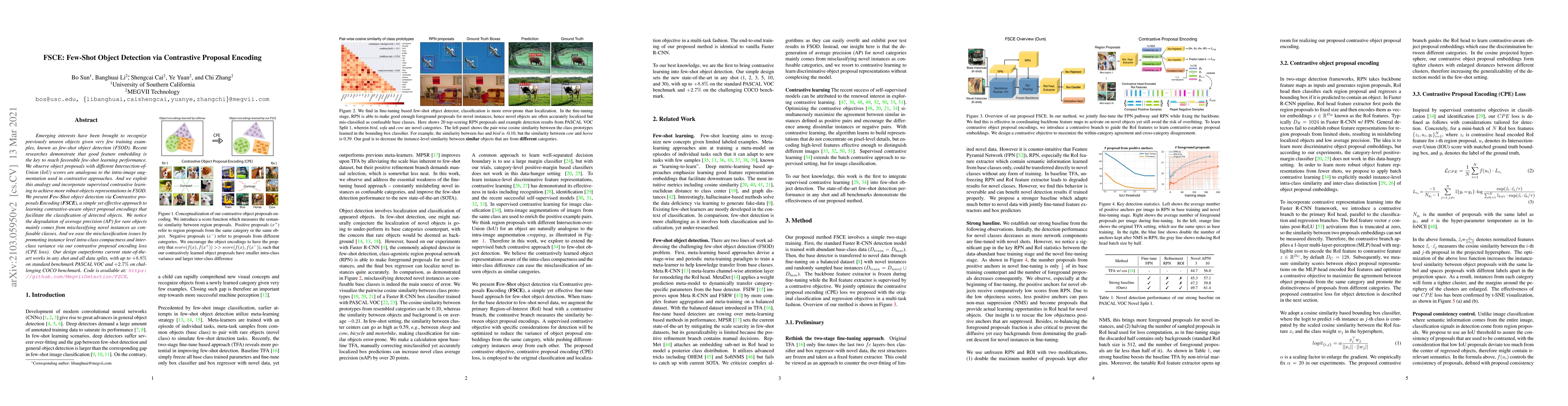 The paper introduces FSCE, a method for few-shot object detection that leverages contrastive proposal encoding to enhance feature embeddings. It achieves superior performance by promoting intra-class compactness and inter-class variance, outperforming current state-of-the-art methods on PASCAL VOC and COCO benchmarks.