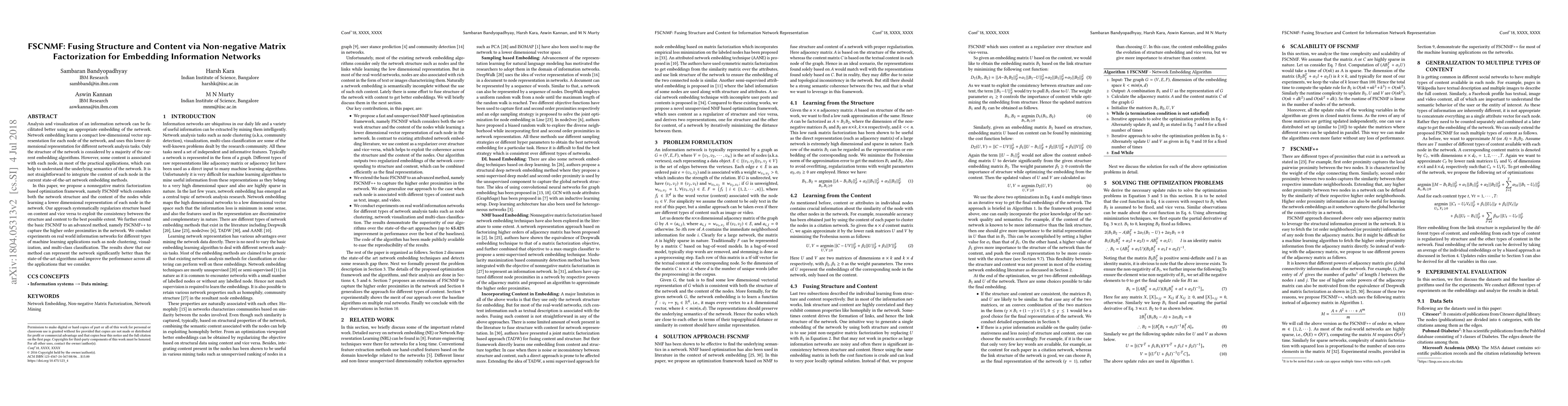 Analysis and visualization of an information network can be facilitated better using an appropriate embedding of the network. Network embedding learns a compact low-dimensional vector representation for each node of the network, and uses this lower dimensional representation for different network analysis tasks. Only the structure of the network is considered by a majority of the current embedding algorithms. However, some content is associated with each node, in most of the practical applications, which can help to understand the underlying semantics of the network. It is not straightforward to integrate the content of each node in the current state-of-the-art network embedding methods. In this paper, we propose a nonnegative matrix factorization based optimization framework, namely FSCNMF which considers both the network structure and the content of the nodes while learning a lower dimensional representation of each node in the network. Our approach systematically regularizes structure based on content and vice versa to exploit the consistency between the structure and content to the best possible extent. We further extend the basic FSCNMF to an advanced method, namely FSCNMF++ to capture the higher order proximities in the network. We conduct experiments on real world information networks for different types of machine learning applications such as node clustering, visualization, and multi-class classification. The results show that our method can represent the network significantly better than the state-of-the-art algorithms and improve the performance across all the applications that we consider.