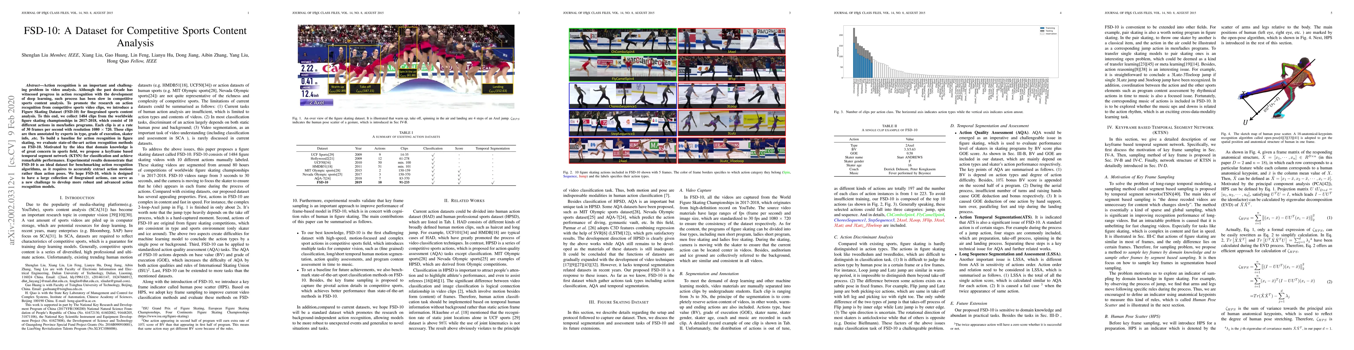 The FSD-10 dataset, comprising 1484 figure skating clips from 2017-2018 championships, aims to advance action recognition in competitive sports. It includes detailed annotations and is evaluated using state-of-the-art methods, with a proposed keyframe-based temporal segment network achieving notable performance.