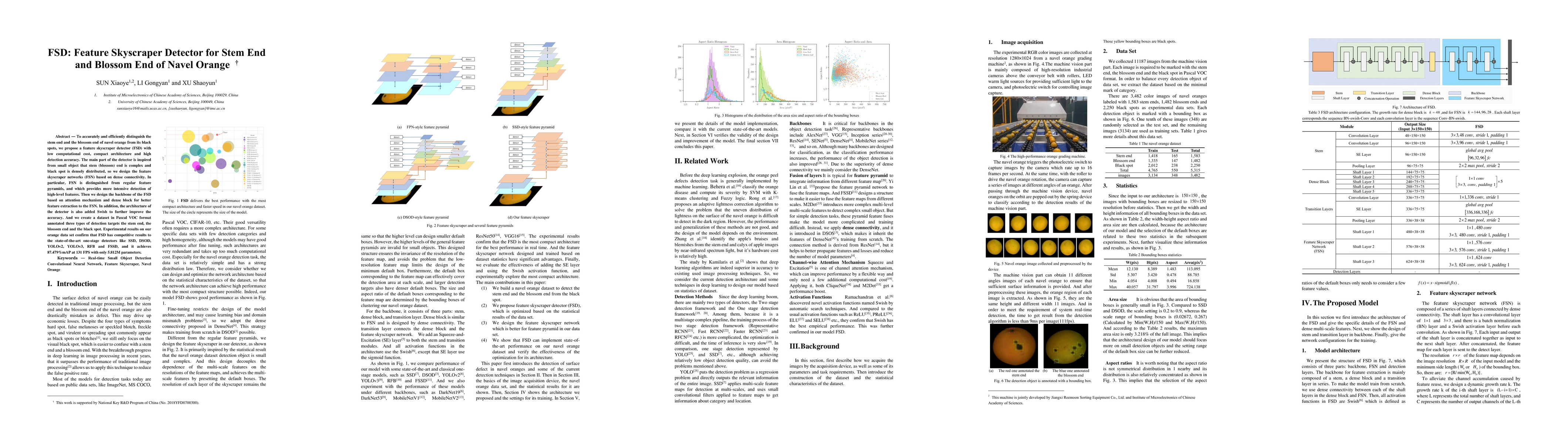 To accurately and efficiently distinguish the stem end and the blossom end of navel orange from its black spots, we propose a feature skyscraper detector (FSD) with low computational cost, compact architecture and high detection accuracy. The main part of the detector is inspired from small object that stem (blossom) end is complex and black spot is densely distributed, so we design the feature skyscraper networks (FSN) based on dense connectivity. In particular, FSN is distinguished from regular feature pyramids, and which provides more intensive detection of high-level features. Then we design the backbone of the FSD based on attention mechanism and dense block for better feature extraction to the FSN. In addition, the architecture of the detector is also added Swish to further improve the accuracy. And we create a dataset in Pascal VOC format annotated three types of detection targets the stem end, the blossom end and the black spot. Experimental results on our orange data set confirm that FSD has competitive results to the state-of-the-art one-stage detectors like SSD, DSOD, YOLOv2, YOLOv3, RFB and FSSD, and it achieves 87.479%mAP at 131 FPS with only 5.812M parameters.