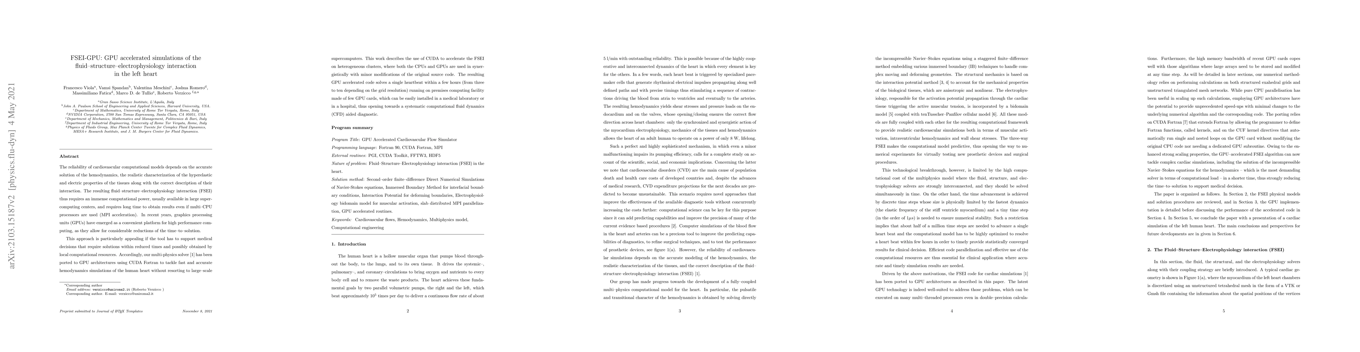 The reliability of cardiovascular computational models depends on the accurate solution of the hemodynamics, the realistic characterization of the hyperelastic and electric properties of the tissues along with the correct description of their interaction. The resulting fluid-structure-electrophysiology interaction (FSEI) thus requires an immense computational power, usually available in large supercomputing centers, and requires long time to obtain results even if multi-CPU processors are used (MPI acceleration). In recent years, graphics processing units (GPUs) have emerged as a convenient platform for high performance computing, as they allow for considerable reductions of the time-to-solution. This approach is particularly appealing if the tool has to support medical decisions that require solutions within reduced times and possibly obtained by local computational resources. Accordingly, our multi-physics solver has been ported to GPU architectures using CUDA Fortran to tackle fast and accurate hemodynamics simulations of the human heart without resorting to large-scale supercomputers. This work describes the use of CUDA to accelerate the FSEI on heterogeneous clusters, where both the CPUs and GPUs are used in synergistically with minor modifications of the original source code. The resulting GPU accelerated code solves a single heartbeat within a few hours (from three to ten depending on the grid resolution) running on premises computing facility made of few GPU cards, which can be easily installed in a medical laboratory or in a hospital, thus opening towards a systematic computational fluid dynamics (CFD) aided diagnostic.
