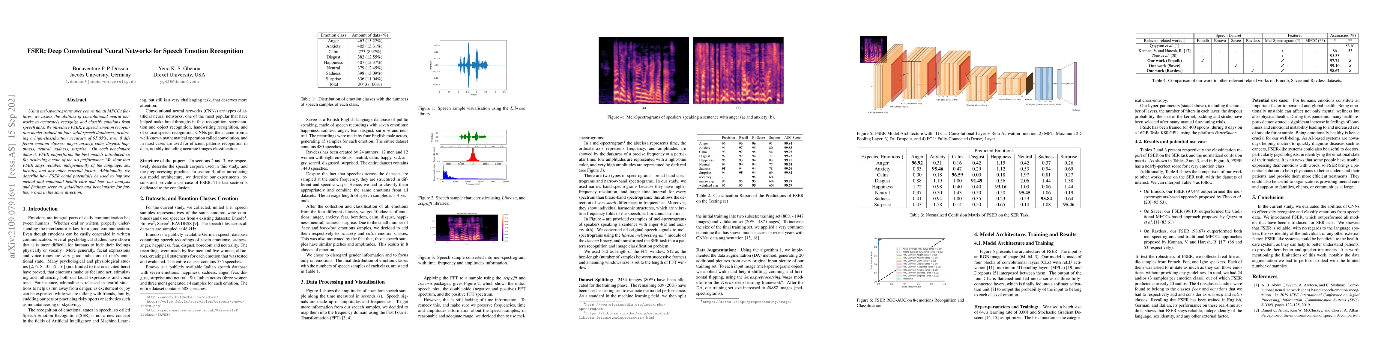 FSER employs deep convolutional neural networks using mel-spectrograms to achieve 95.05% accuracy in speech emotion recognition across eight classes. It outperforms existing models and remains reliable across various demographics, potentially enhancing mental health care.