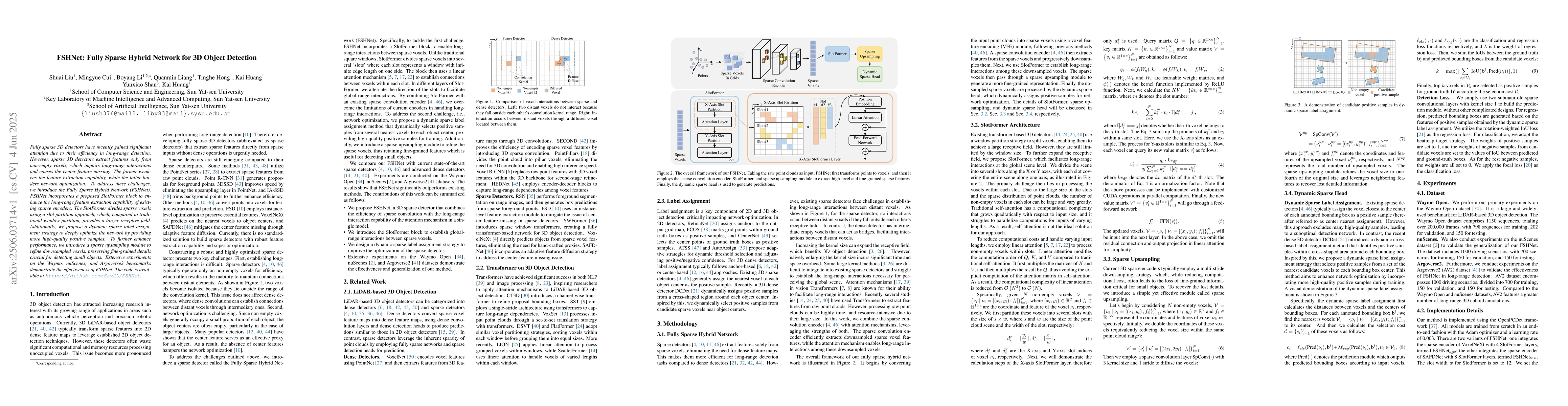 FSHNet improves 3D object detection efficiency with a new hybrid network design that combines long-range feature extraction and high-quality positive samples, achieving state-of-the-art results on Waymo, nuScenes, and Argoverse2 benchmarks.