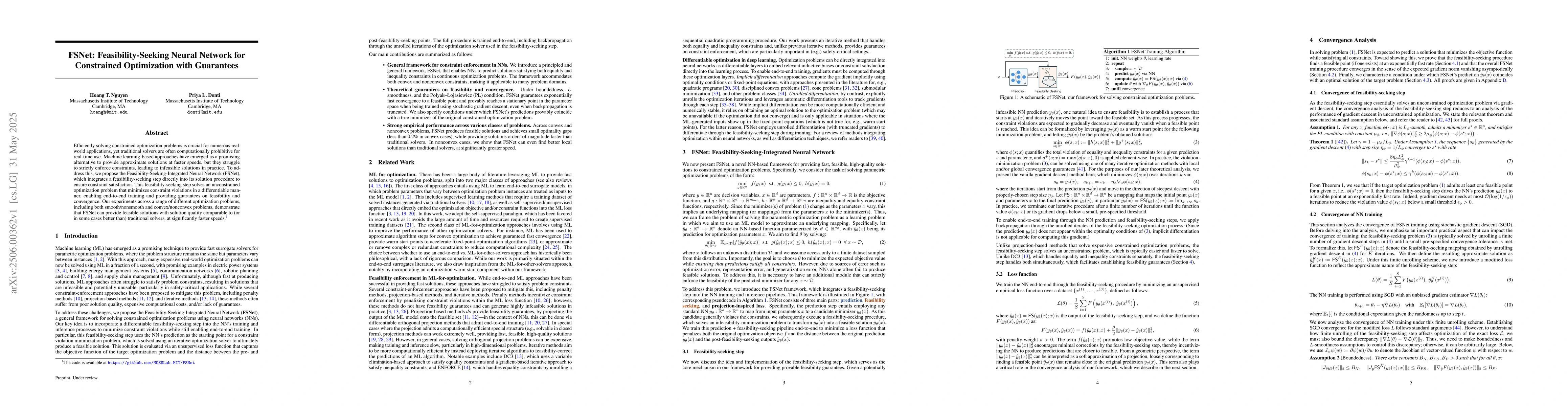 A new neural network called FSNet is proposed to solve constrained optimization problems efficiently with guarantees. It integrates a feasibility-seeking step that ensures constraint satisfaction, providing feasible solutions comparable to traditional solvers at faster speeds.