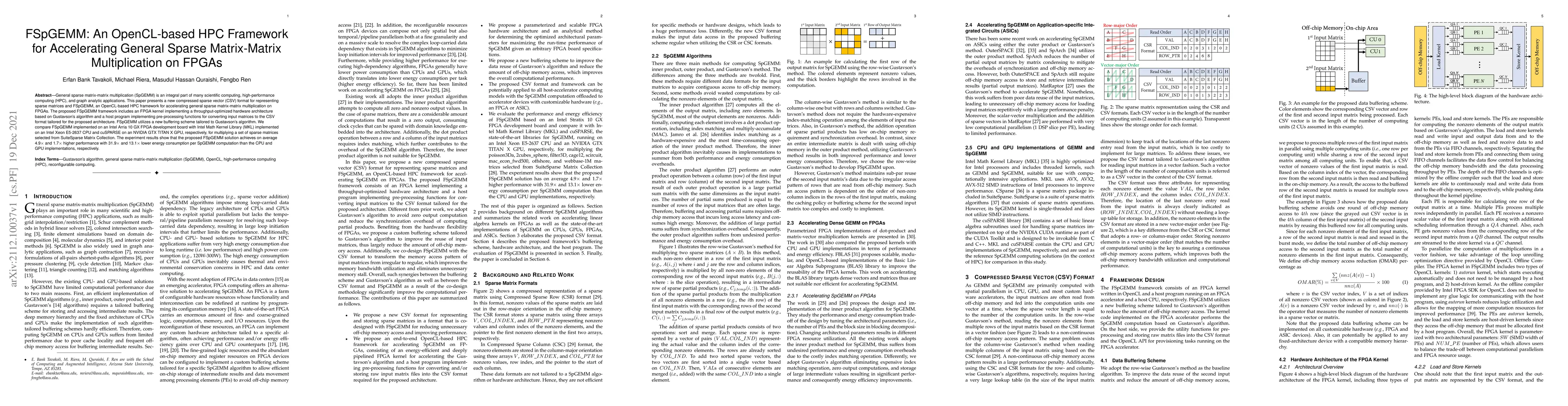 This paper introduces FSpGEMM, an OpenCL-based HPC framework for accelerating sparse matrix-matrix multiplication on FPGAs using a new CSV format. Experimental results show FSpGEMM achieves significantly higher performance and lower energy consumption compared to CPU and GPU implementations.