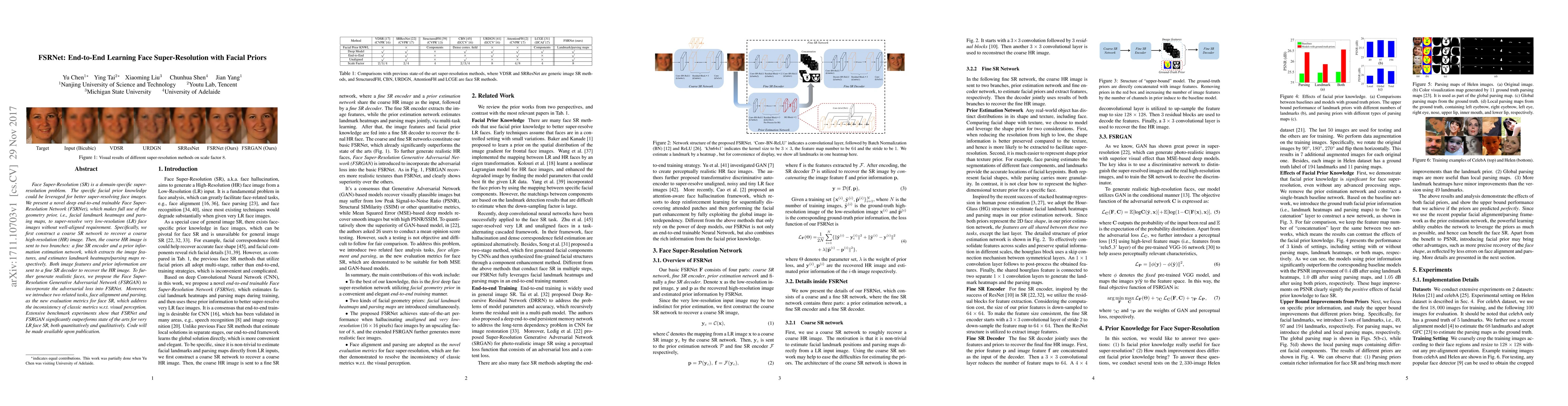 FSRNet is an end-to-end trainable network for face super-resolution that leverages facial priors like landmark heatmaps and parsing maps, achieving superior results for low-resolution face images. It integrates a generative adversarial network (FSRGAN) to enhance realism and introduces new evaluation metrics for face alignment and parsing.