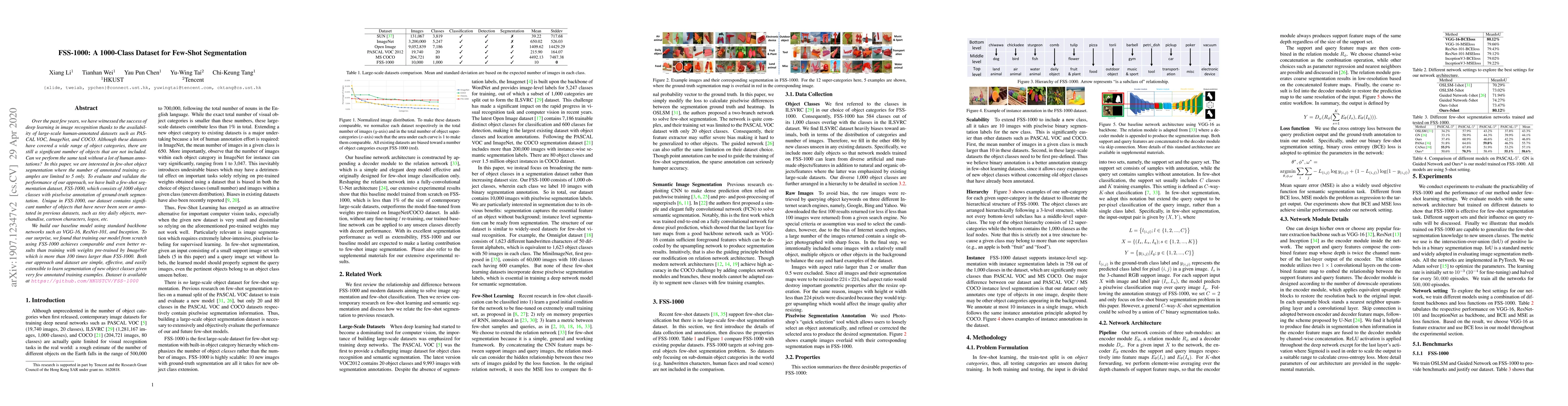 The paper introduces FSS-1000, a dataset of 1000 object classes for few-shot segmentation, aiming to evaluate models trained with limited annotations. Surprisingly, models trained from scratch on FSS-1000 achieve comparable results to those pre-trained on ImageNet, demonstrating the dataset's effectiveness for learning segmentation with minimal data.
