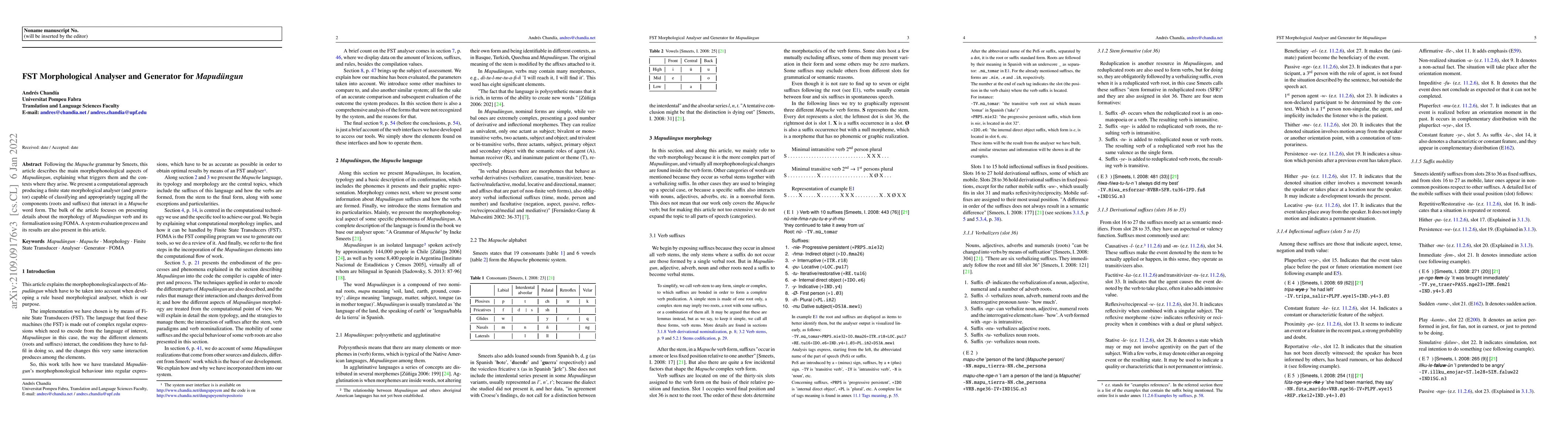 Following the Mapuche grammar by Smeets, this article describes the main morphophonological aspects of Mapud\"ungun, explaining what triggers them and the contexts where they arise. We present a computational approach producing a finite state morphological analyser (and generator) capable of classifying and appropriately tagging all the components (roots and suffixes) that interact in a Mapuche word form. The bulk of the article focuses on presenting details about the morphology of Mapud\"ungun verb and its formalisation using FOMA. A system evaluation process and its results are also present in this article.