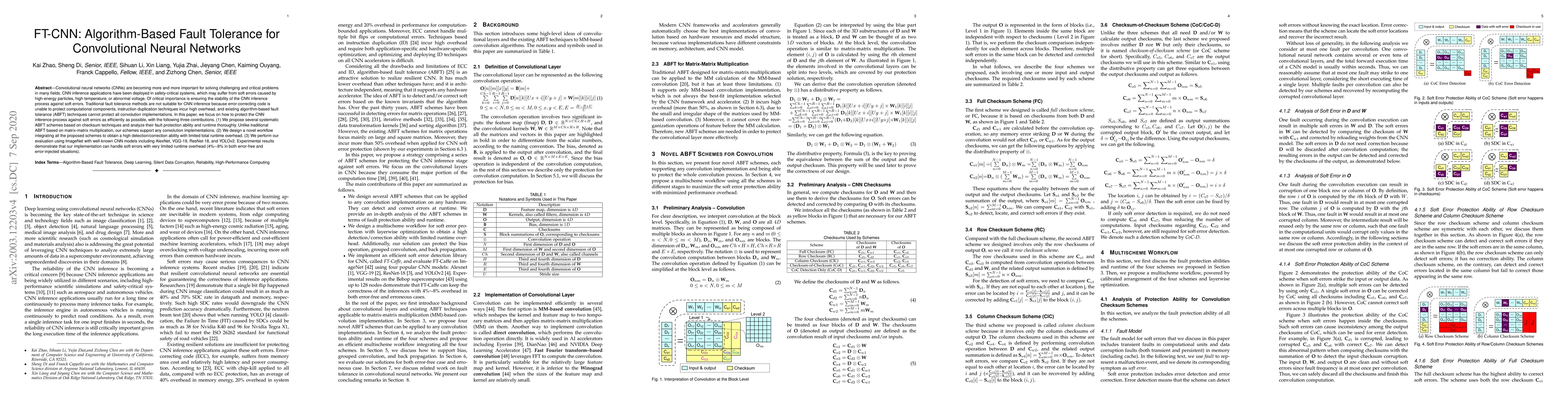 This paper proposes algorithm-based fault tolerance schemes for convolutional neural networks (CNNs) to protect against soft errors, introducing systematic ABFT schemes using checksum techniques that support any convolution implementations. The study integrates these schemes into a workflow to achieve high detection/correction ability with minimal runtime overhead, demonstrated through evaluations on ImageNet with various CNN models.