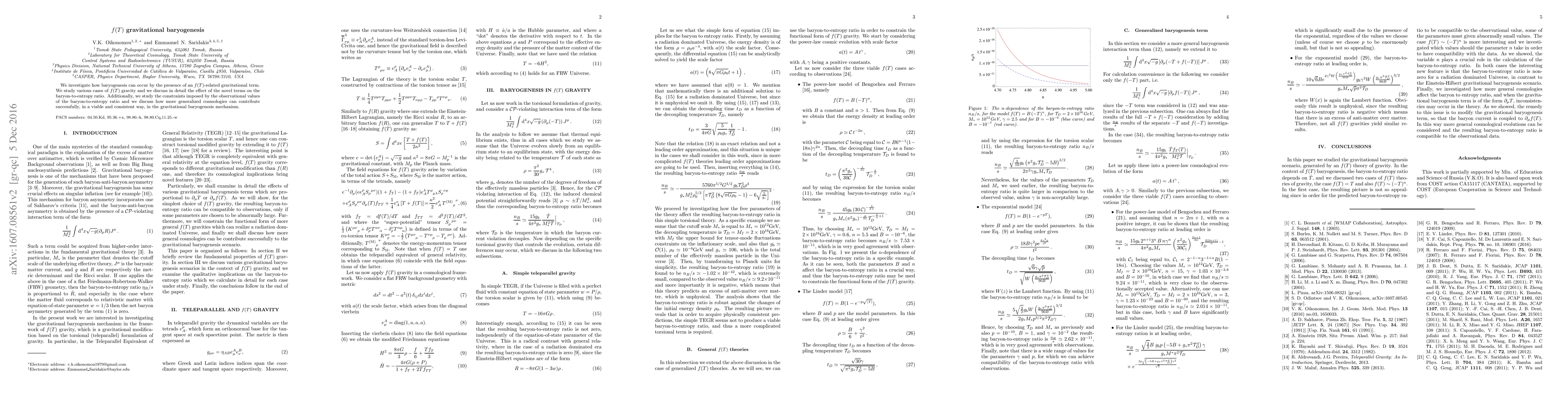The paper explores baryogenesis through $f(T)$ gravity, examining how novel gravitational terms influence the baryon-to-entropy ratio. It also assesses observational constraints and discusses how generalized cosmologies can support this mechanism.