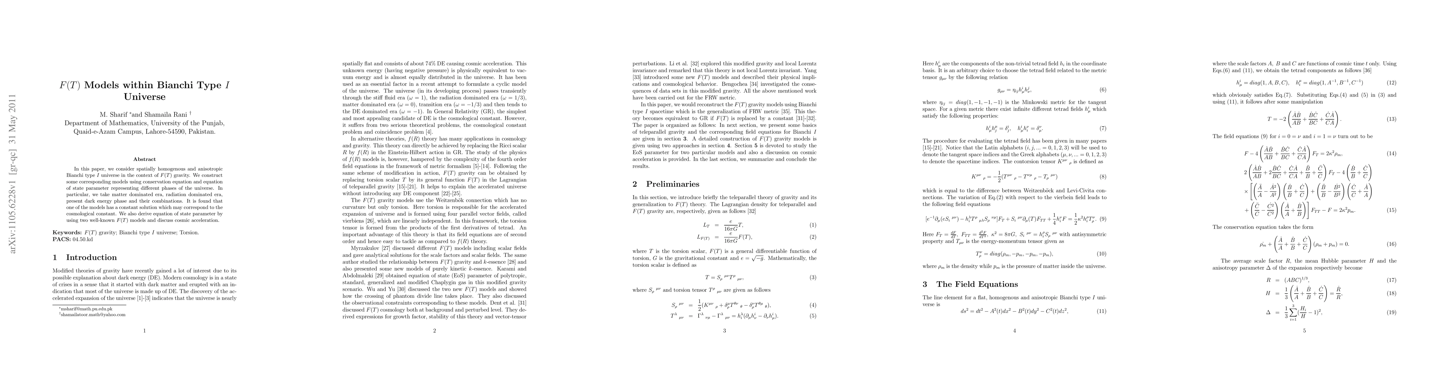 This paper explores spatially homogeneous and anisotropic Bianchi type I universes in F(T) gravity, constructing models for different phases including matter and radiation domination and dark energy. One model exhibits a constant solution potentially corresponding to the cosmological constant, and the study discusses cosmic acceleration using the equation of state parameter.