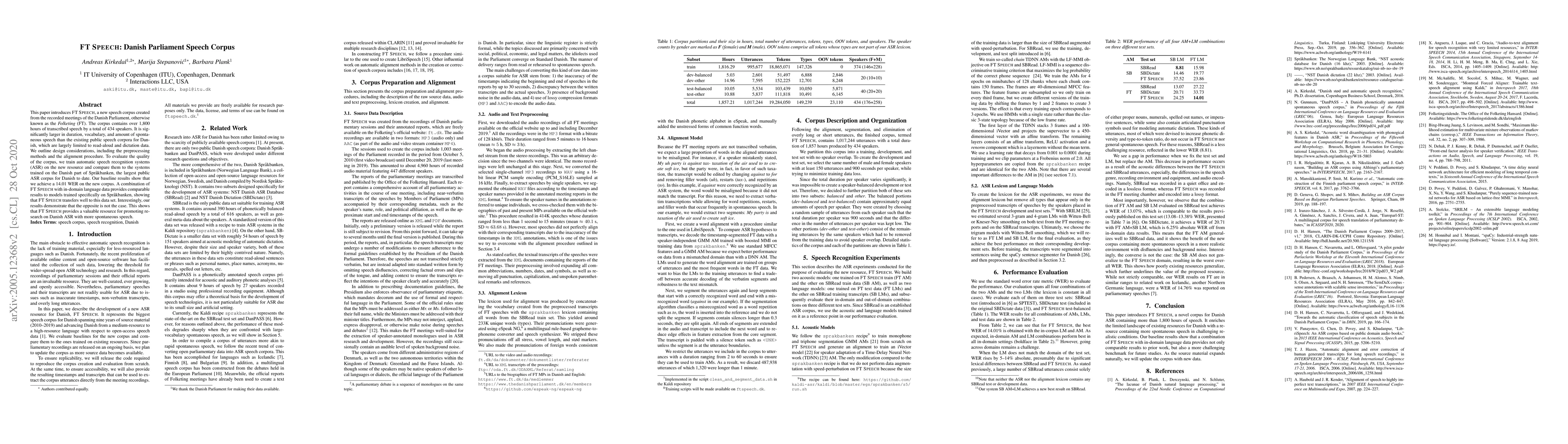 This paper introduces FT Speech, a large Danish Parliament speech corpus with over 1,800 hours of transcribed spontaneous speech from 434 speakers, significantly surpassing existing public Danish speech corpora. The corpus's quality is validated by achieving comparable automatic speech recognition results when combined with in-domain language data.