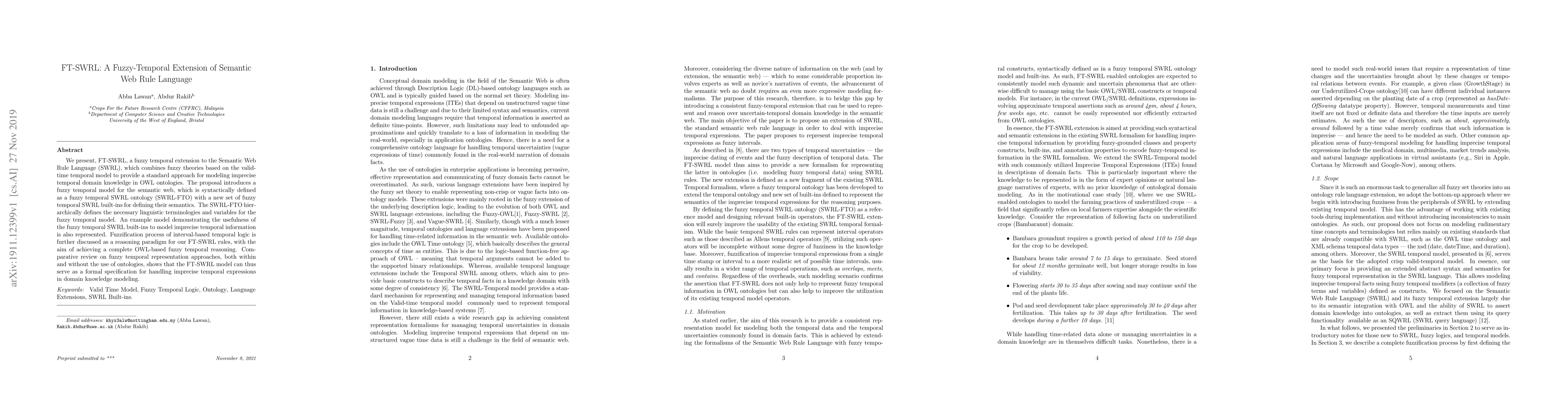 FT-SWRL extends Semantic Web Rule Language (SWRL) by integrating fuzzy temporal models to handle imprecise temporal domain knowledge in OWL ontologies, introducing new fuzzy temporal built-ins and demonstrating its utility through an example model. This approach aims to provide a comprehensive OWL-based fuzzy temporal reasoning framework.