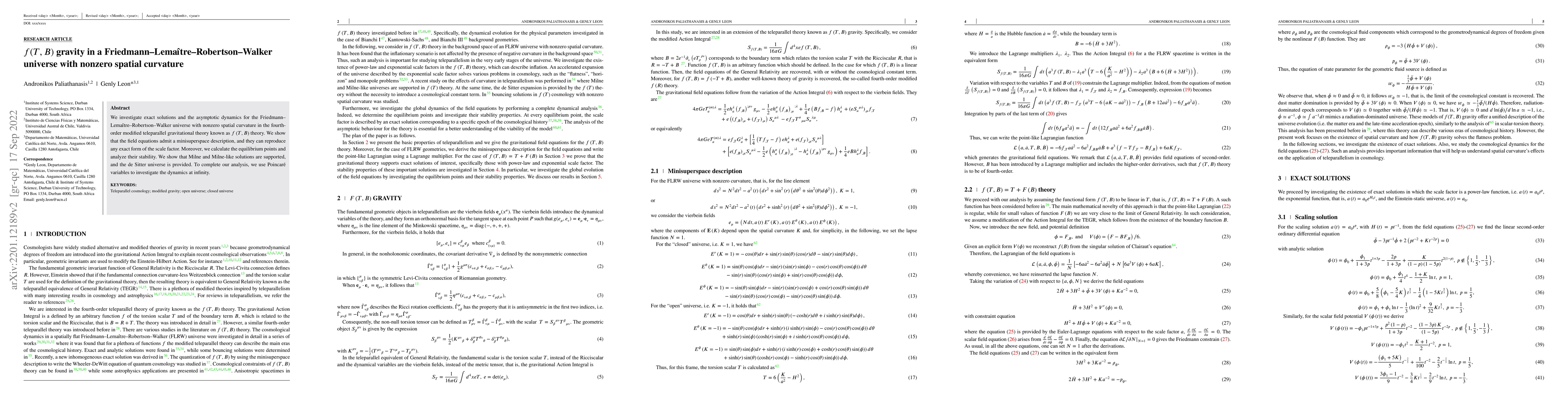 We investigate exact solutions and the asymptotic dynamics for the Friedmann-Lema\^{\i}tre-Robertson-Walker universe with nonzero spatial curvature in the fourth-order modified teleparallel gravitational theory known as $f\left( T, B\right) $ theory. We show that the field equations admit a minisuperspace description, and they can reproduce any exact form of the scale factor. Moreover, we calculate the equilibrium points and analyze their stability. We show that Milne and Milne-like solutions are supported, and the de Sitter universe is provided. To complete our analysis, we use Poincar\'e variables to investigate the dynamics at infinity.