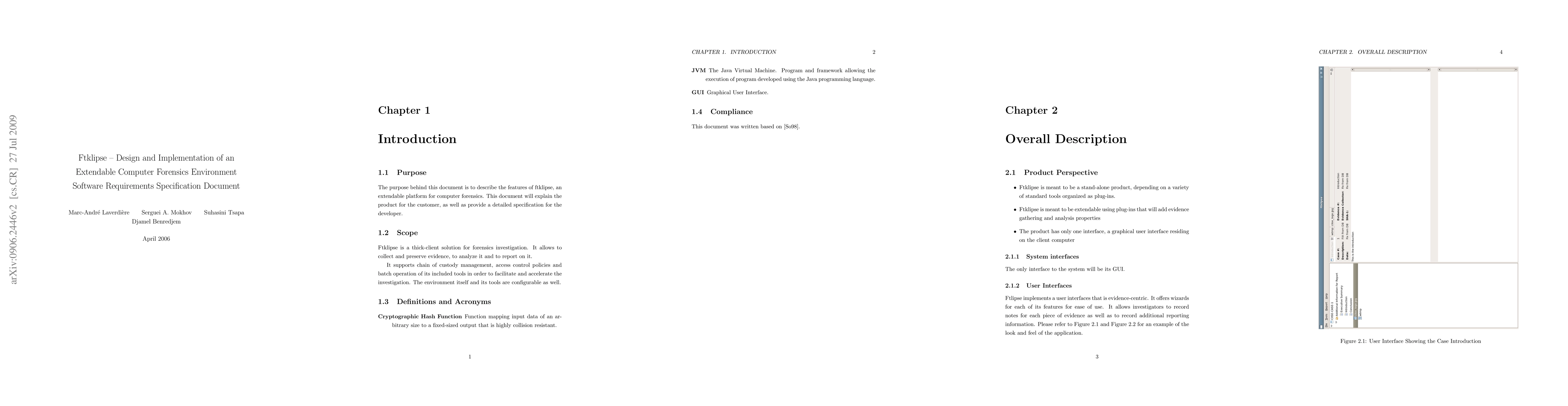Ftklipse is an extendable, thick-client platform for computer forensics designed to collect, analyze, and report on evidence, featuring chain of custody management and configurable tools based on the Eclipse framework. The software requirements specification document outlines its detailed features and development specifications.
