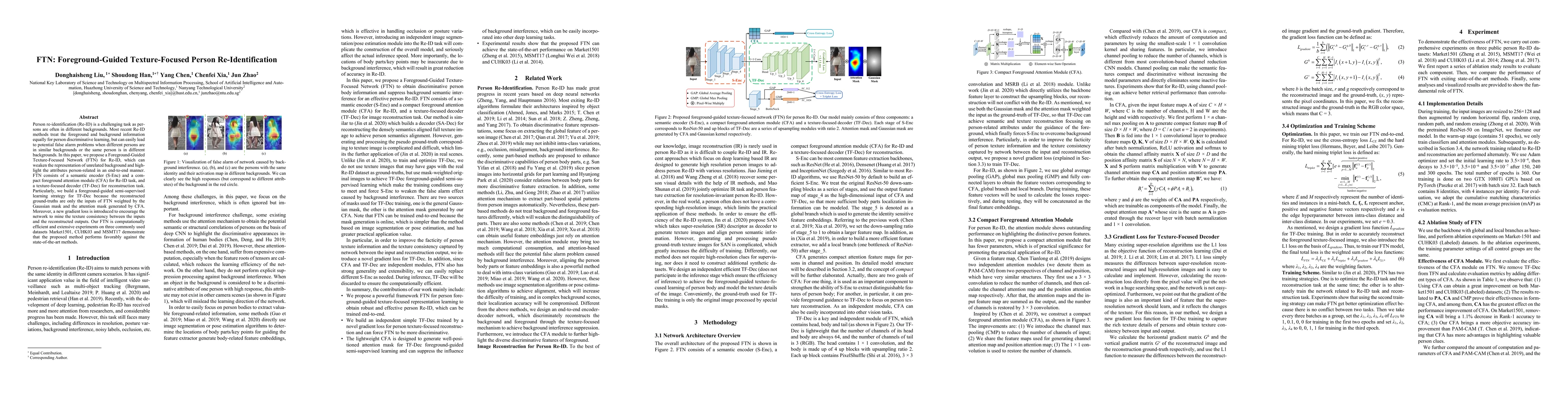 The paper proposes a Foreground-Guided Texture-Focused Network (FTN) for person re-identification, which emphasizes foreground details and texture to improve discriminative learning, reducing false alarms. Experiments on Market1501, CUHK03, and MSMT17 show FTN's competitive performance against state-of-the-art methods.