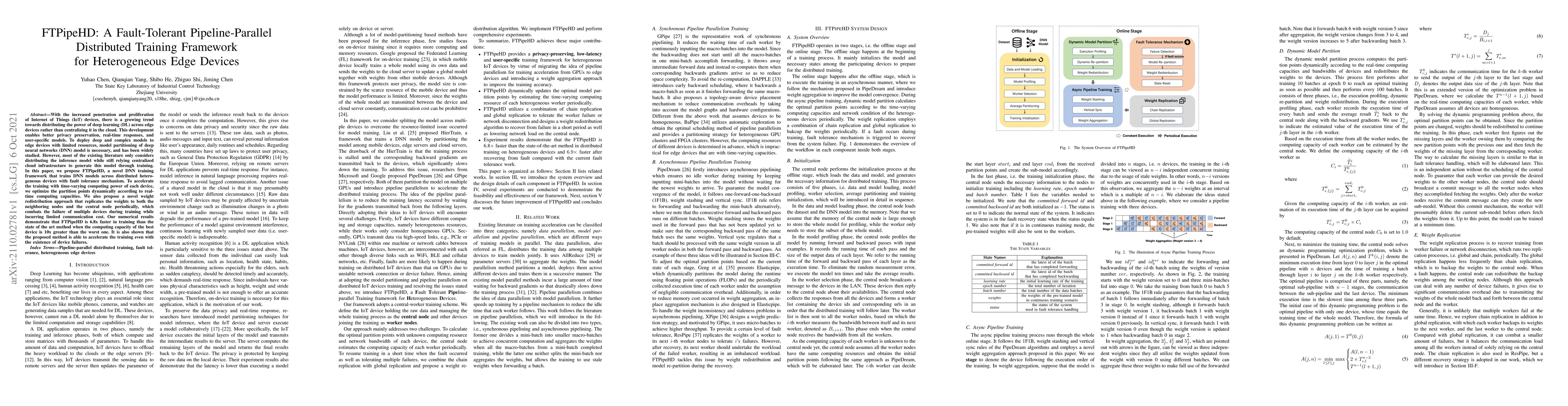 FTPipeHD is a novel fault-tolerant distributed training framework for training deep neural networks across heterogeneous edge devices. It dynamically optimizes model partitioning and employs a weight redistribution strategy to enhance fault tolerance and accelerate training, achieving 6.8x faster training compared to existing methods.