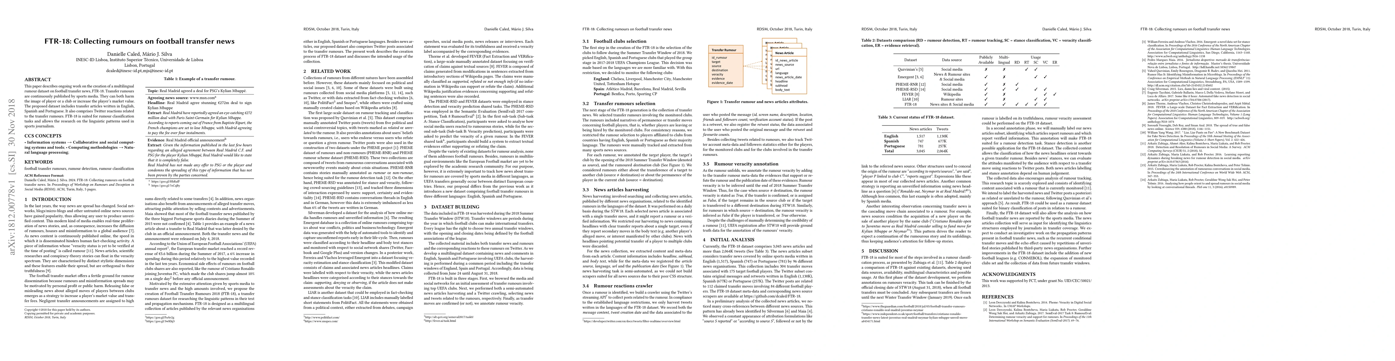 This paper describes ongoing work on the creation of a multilingual rumour dataset on football transfer news, FTR-18. Transfer rumours are continuously published by sports media. They can both harm the image of player or a club or increase the player's market value. The proposed dataset includes transfer articles written in English, Spanish and Portuguese. It also comprises Twitter reactions related to the transfer rumours. FTR-18 is suited for rumour classification tasks and allows the research on the linguistic patterns used in sports journalism.