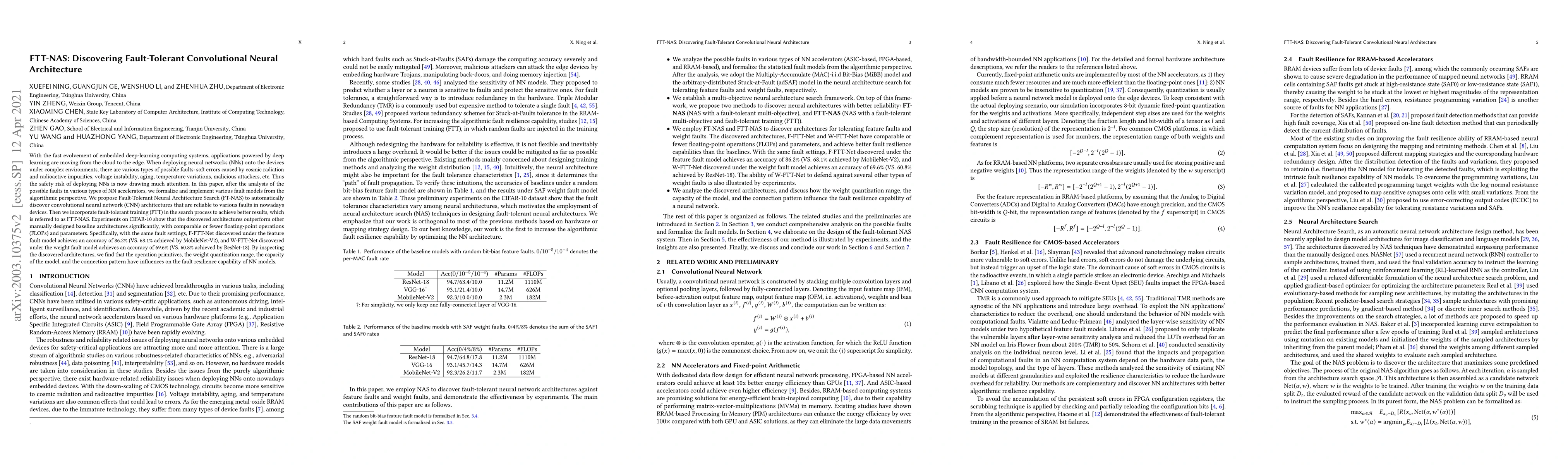 This paper proposes Fault-Tolerant Neural Architecture Search (FTT-NAS) to automatically discover fault-tolerant convolutional neural network architectures for edge devices. Experiments on CIFAR-10 show that the discovered architectures outperform baselines like MobileNet-V2 and ResNet-20 while maintaining comparable or fewer computational resources.