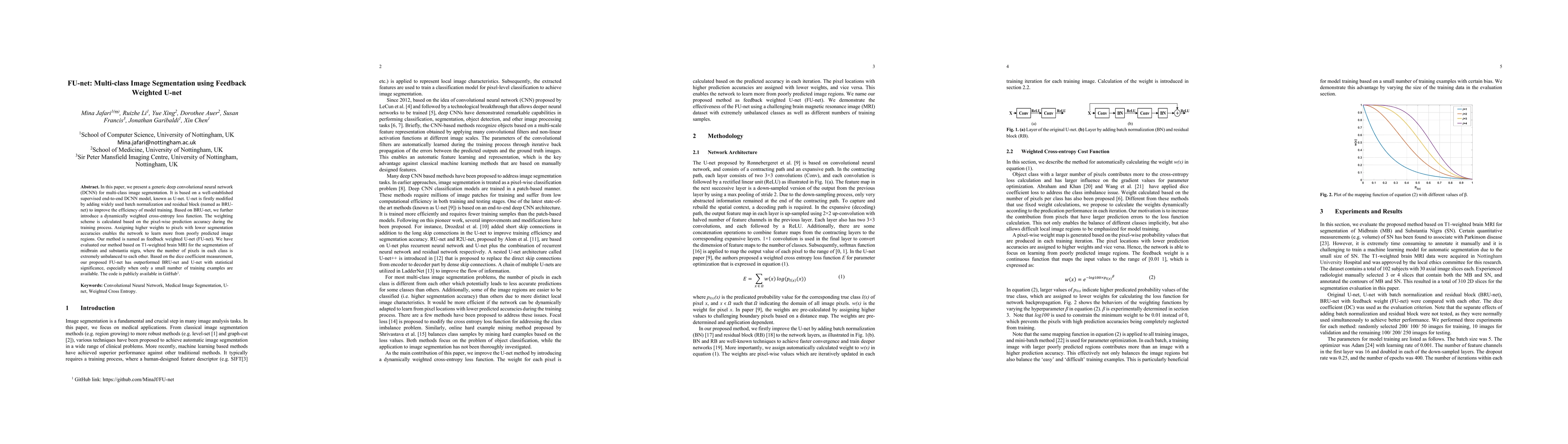 In this paper, we present a generic deep convolutional neural network (DCNN) for multi-class image segmentation. It is based on a well-established supervised end-to-end DCNN model, known as U-net. U-net is firstly modified by adding widely used batch normalization and residual block (named as BRU-net) to improve the efficiency of model training. Based on BRU-net, we further introduce a dynamically weighted cross-entropy loss function. The weighting scheme is calculated based on the pixel-wise prediction accuracy during the training process. Assigning higher weights to pixels with lower segmentation accuracies enables the network to learn more from poorly predicted image regions. Our method is named as feedback weighted U-net (FU-net). We have evaluated our method based on T1- weighted brain MRI for the segmentation of midbrain and substantia nigra, where the number of pixels in each class is extremely unbalanced to each other. Based on the dice coefficient measurement, our proposed FU-net has outperformed BRU-net and U-net with statistical significance, especially when only a small number of training examples are available. The code is publicly available in GitHub (GitHub link: https://github.com/MinaJf/FU-net).