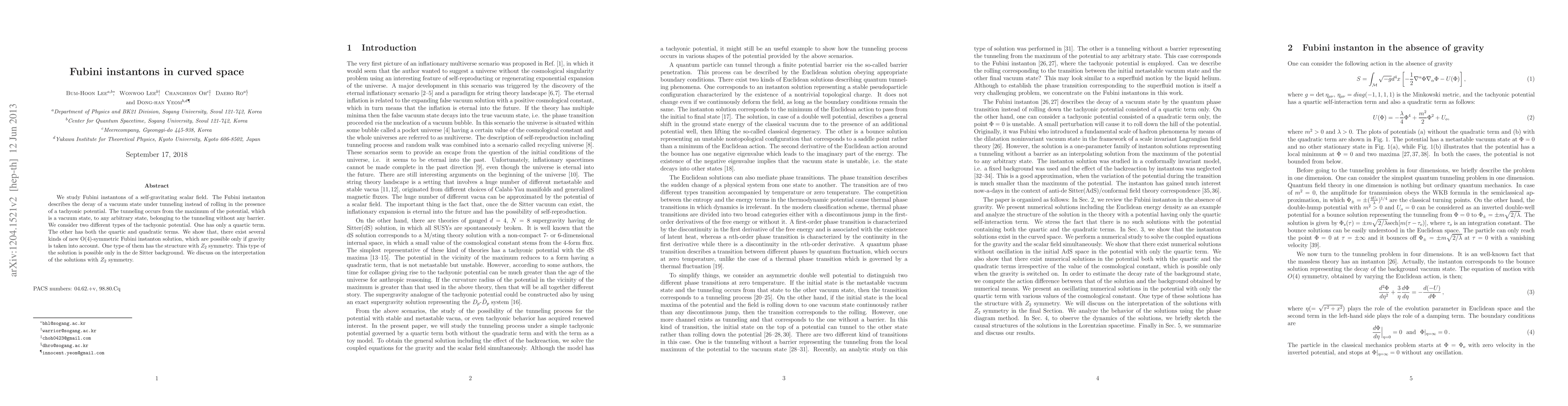 We study Fubini instantons of a self-gravitating scalar field. The Fubini instanton describes the decay of a vacuum state under tunneling instead of rolling in the presence of a tachyonic potential. The tunneling occurs from the maximum of the potential, which is a vacuum state, to any arbitrary state, belonging to the tunneling without any barrier. We consider two different types of the tachyonic potential. One has only a quartic term. The other has both the quartic and quadratic terms. We show that, there exist several kinds of new O(4)-symmetric Fubini instanton solution, which are possible only if gravity is taken into account. One type of them has the structure with $Z_2$ symmetry. This type of the solution is possible only in the de Sitter background. We discuss on the interpretation of the solutions with $Z_2$ symmetry.