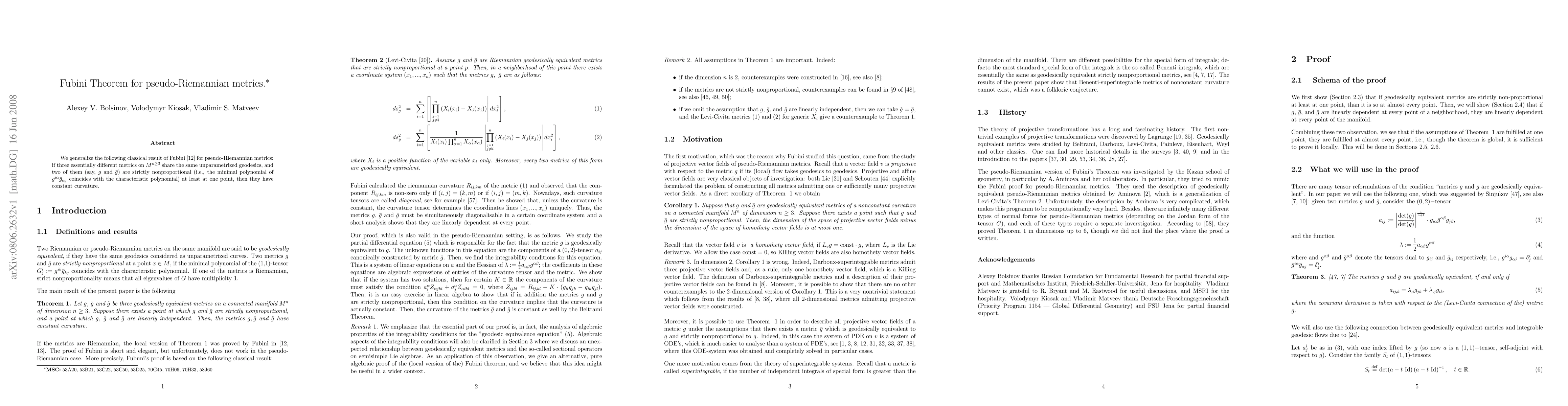 We generalize the following classical result of Fubini for pseudo-Riemannian metrics: if three essentially different metrics on $M^{n\ge 3}$ share the same unparametrized geodesics, and two of them (say, $g$ and $\bar g$) are strictly nonproportional (i.e., the minimal polynomial of $g^{i\alpha} \bar g_{\alpha j}$ coincides with the characteristic polynomial) at least at one point, then they have constant curvature.