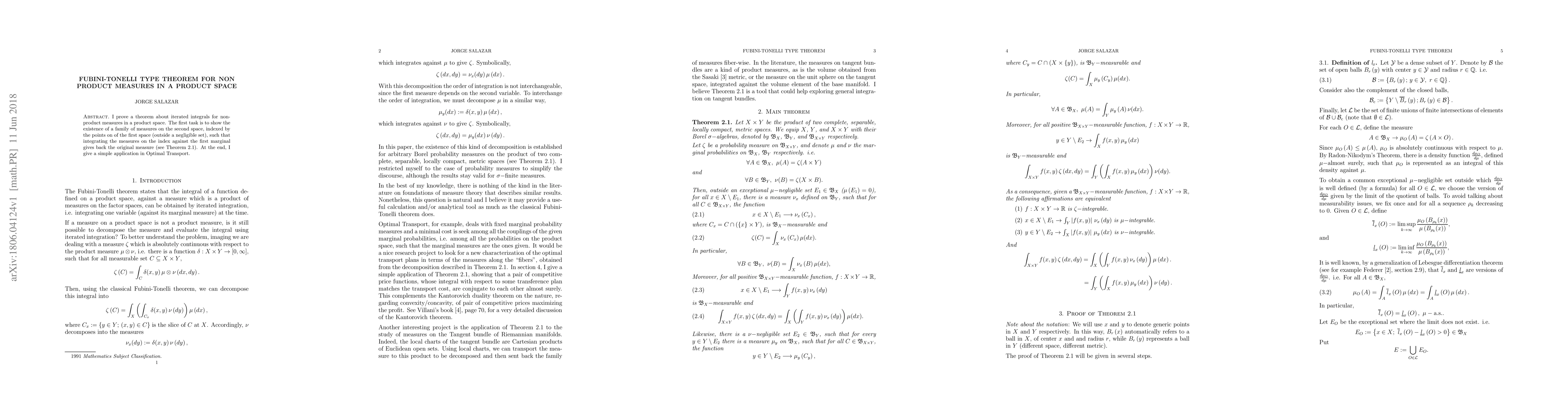 This paper proves a Fubini-Tonelli type theorem for non-product measures in product spaces, allowing for the integration of measures on one space against another, with implications for optimal transport applications.