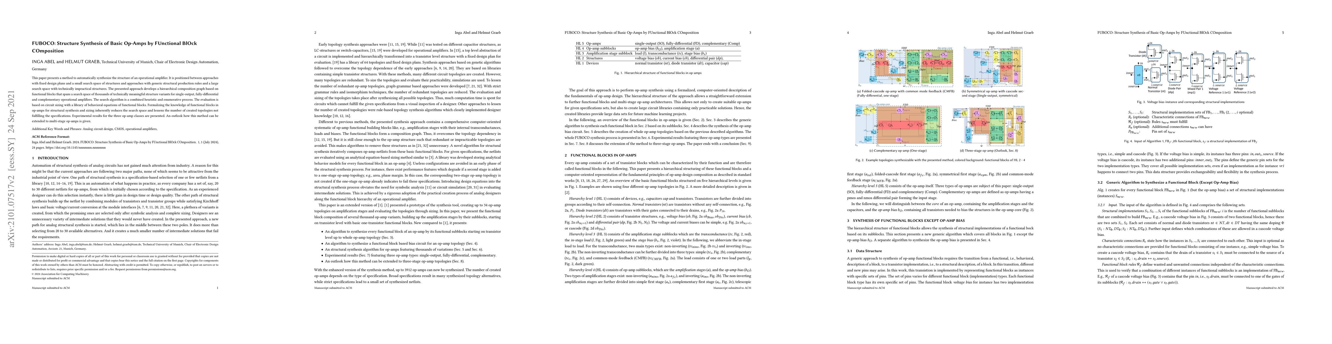 This paper introduces FUBOCO, a method for automatic operational amplifier structure synthesis. It utilizes a hierarchical composition graph based on functional blocks, generating thousands of technically feasible structure variants. The search algorithm combines heuristic and enumerative processes, reducing the search space and improving specification fulfillment.
