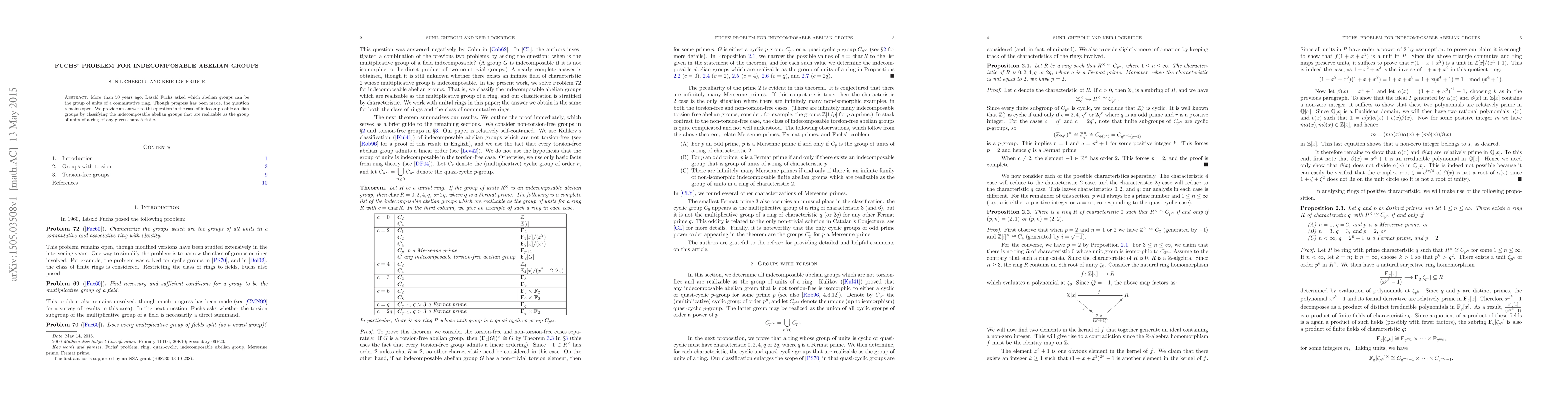 Fuchs' problem for indecomposable abelian groups classifies which indecomposable abelian groups can serve as the group of units of a commutative ring. The study provides a definitive answer for these groups across any given ring characteristic.